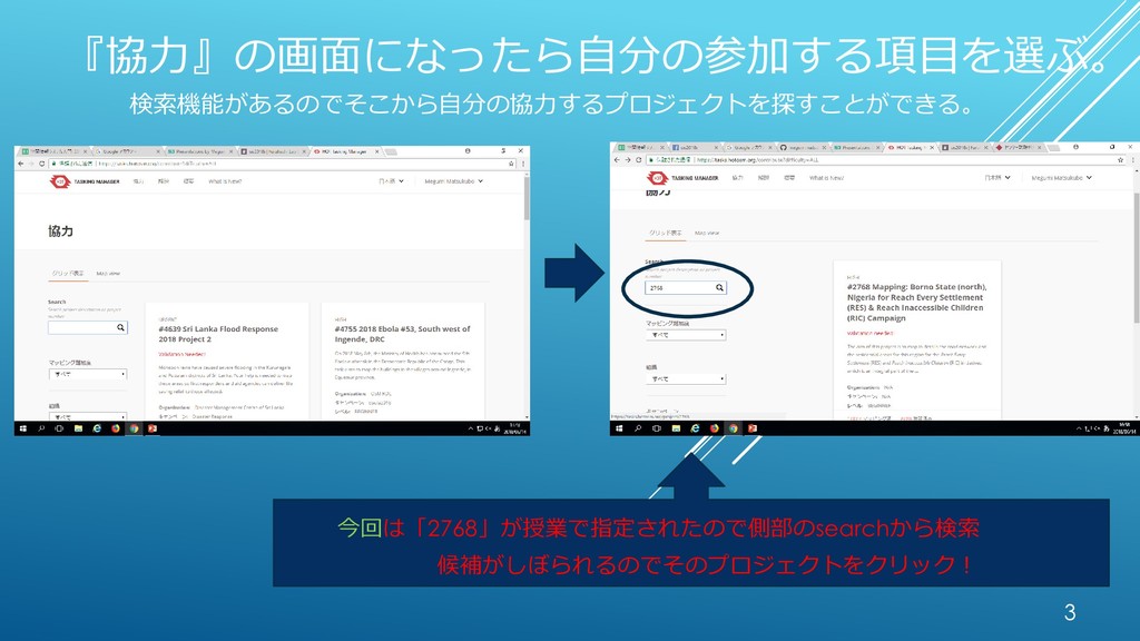 『協力』の画面になったら自分の参加する項目を選ぶ。 検索機能があるのでそこから自分の協力するプロジェクトを探すことができる。 今回は「2768」が授業で指定されたので側部のsearchから検索 候補がしぼられるのでそのプロジェクトをクリック! 3