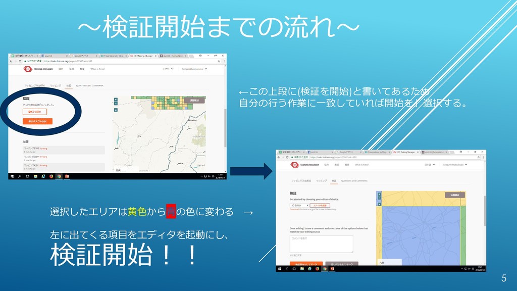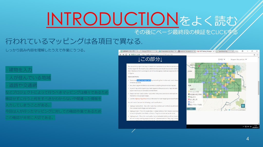 INTRODUCTIONをよく読む その後にページ最終段の検証をCLICKする 行われているマッピングは各項目で異なる。 しっかり読み内容を理解したうえで作業にうつる。 ・建物を入力 ・人が住んでいる地域 ・道路や交通網 などプロジェクトによって行うべきマッピングは様々であるため 確認せずに行うと何をすべきかわからないや間違った情報を 入力してしまうことがある。