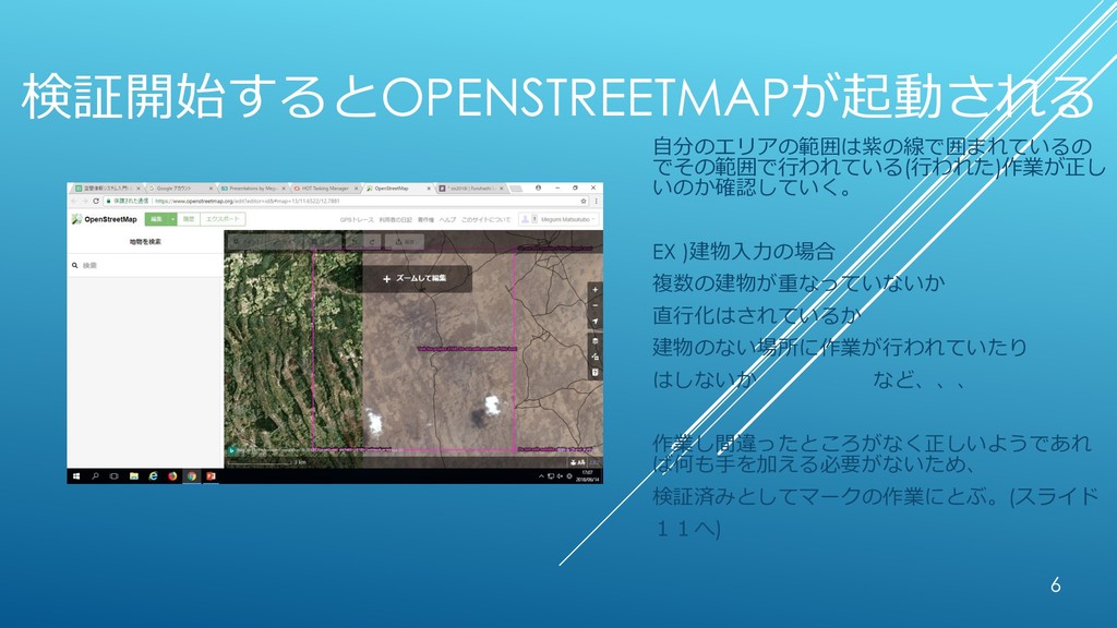 検証開始するとOPENSTREETMAPが起動される 自分のエリアの範囲は紫の線で囲まれているの でその範囲で行われている(行われた)作業が正し いのか確認していく。 EX )建物入力の場合 複数の建物が重なっていないか 直行化はされているか 建物のない場所に作業が行われていたり はしないか