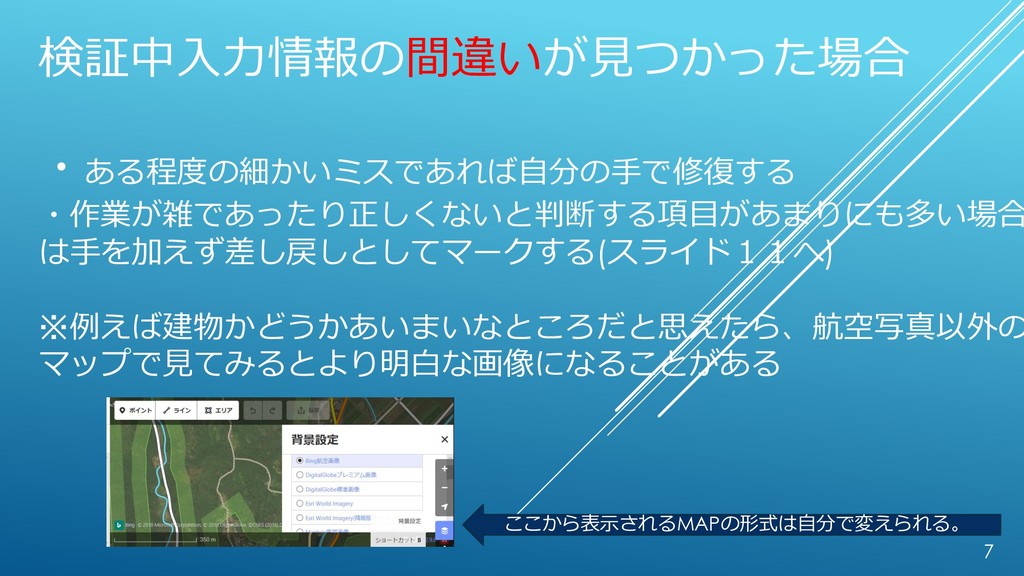 検証中入力情報の間違いが見つかった場合 ・ある程度の細かいミスであれば自分の手で修復する ・作業が雑であったり正しくないと判断する項目があまりにも多い場合 は手を加えず差し戻しとしてマークする(スライド11へ) ※例えば建物かどうかあいまいなところだと思えたら、航空写真以外の マップで見てみるとより明白な画像になることがある 7 ここから表示されるMAPの形式は自分で変えられる。