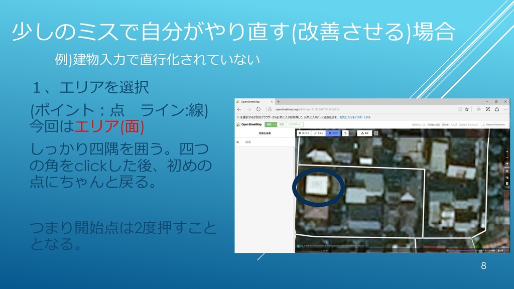 少しのミスで自分がやり直す(改善させる)場合 例)建物入力で直行化されていない 1、エリアを選択 (ポイント:点 ライン:線) 今回はエリア(面) しっかり四隅を囲う。四つ の角をclickした後、初めの 点にちゃんと戻る。 つまり開始点は2度押すこと