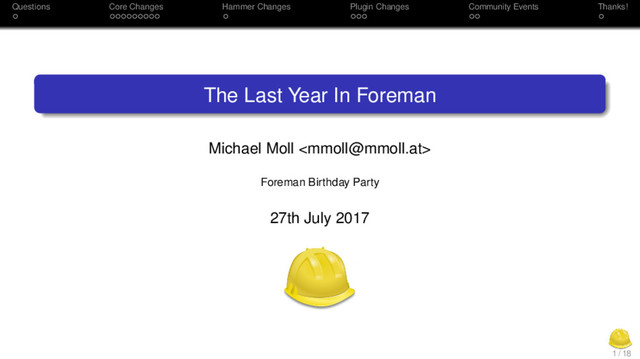 Operating System Support EL 6 based OSes desupported with 1.13 Unofficial 1.13.2 RPMs available from Katello repositories Fedora 24 builds dropped with 1.16 Only 2% of Foreman server installs on Fedora Unclear if Fedora 26 builds will be established Debian/stretch (hopefully) supported with 1.16 Dependency on PuppetLabs’ packages in some areas Puppet master 4.x (not Puppetserver) not supported by Proxy Ubuntu/trusty builds dropped with 1.16 Debian/jessie will probably be desupported with 1.17 ARM64 builds available for Debian based OSes again ODroid C2 or ROCK64 are nice all-in-one demo boxes 4 / 18