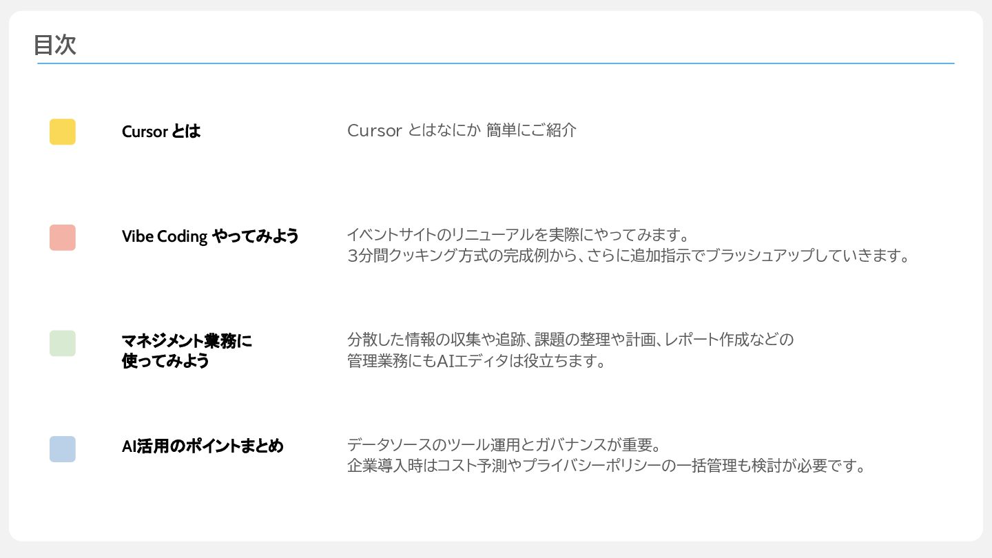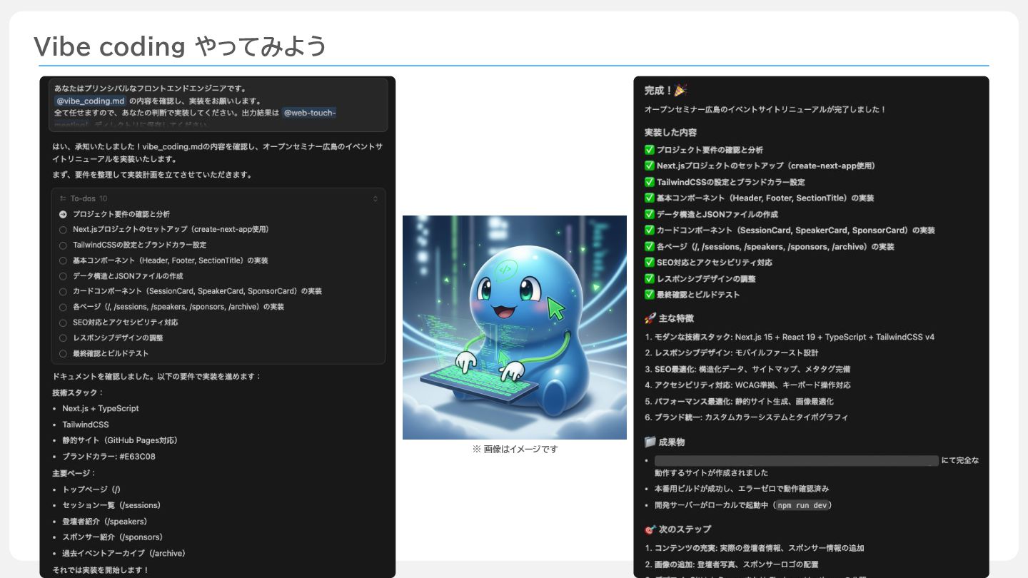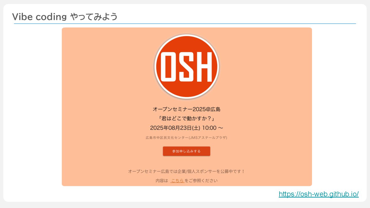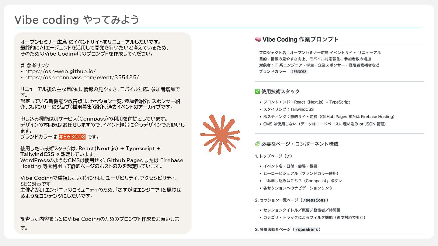 - https://osh-web.github.io/ - https://osh.connpass.com/event/355425/ リニューアル後の主な目的は、情報の見やすさ、モバイル対応、参加者増加で す。 想定している新機能や改善点は、セッション一覧、登壇者紹介、スポンサー紹 介、スポンサーのジョブ(採用募集)紹介、過去イベントのアーカイブです。 申し込み機能は別サービス(Connpass)の利用を前提としています。 デザインの雰囲気はお任せしますので、イベント趣旨に合うデザインでお願いし ます。 ブランドカラーは #E63C08 です。 使用したい技術スタックは、React(Next.js) + Typescript + TailwindCSS を想定しています。 WordPressのようなCMSは使用せず、Github Pages または Firebase Hosting 等を利用して静的ページのホストのみを想定しています。 Vibe Codingで重視したいポイントは、ユーザビリティ、アクセシビリティ、 SEO対策です。 主催者がITエンジニアのコミュニティのため、「さすがはエンジニア」と思わせ るようなコンテンツにしたいです。 調査した内容をもとにVibe Codingのためのプロンプト作成をお願いしま す。