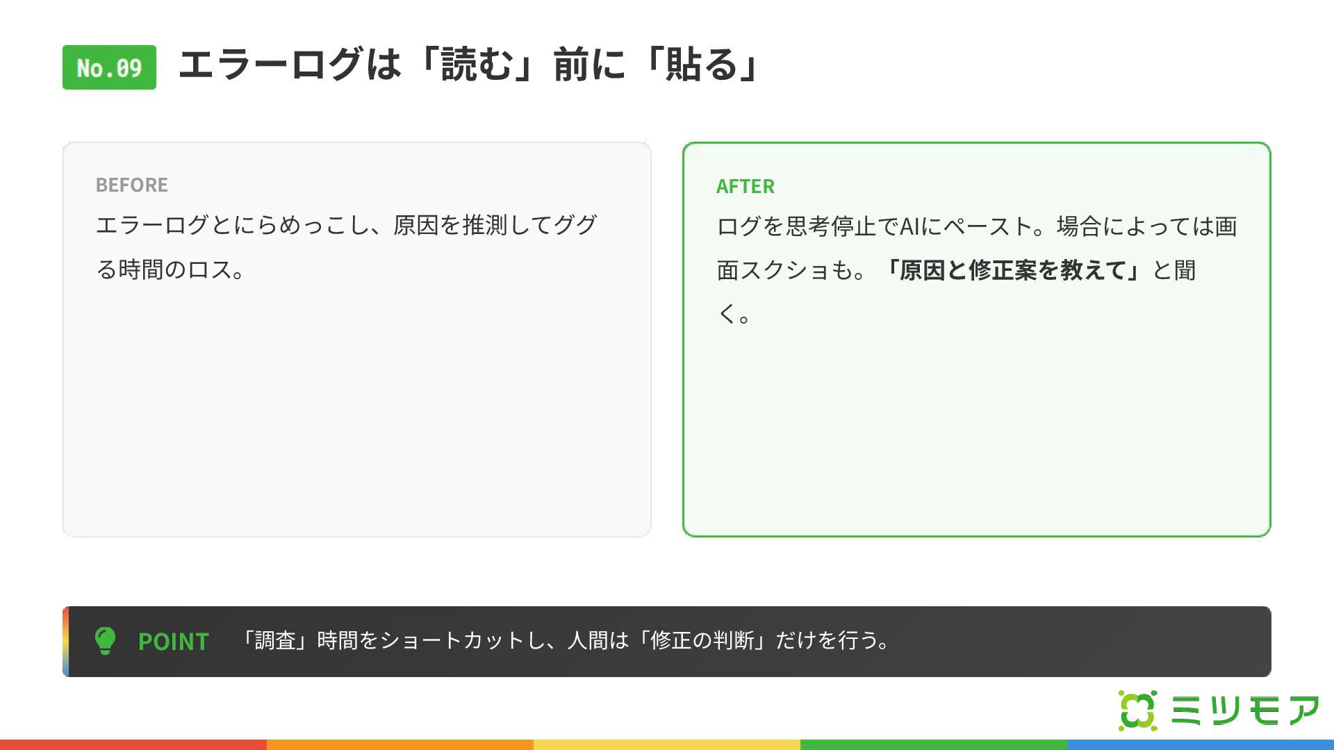 エラーログは「読む」前に「貼る」 POINT 「調査」時間をショートカットし、⼈間は「修正の判断」だけを⾏う。 BEFORE エラーログとにらめっこし、原因を推測してググ る時間のロス。 AFTER ログを思考停⽌でAIにペースト。場合によっては画 ⾯スクショも。「原因と修正案を教えて」と聞 く。