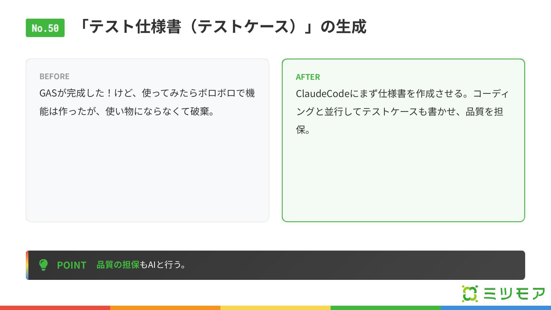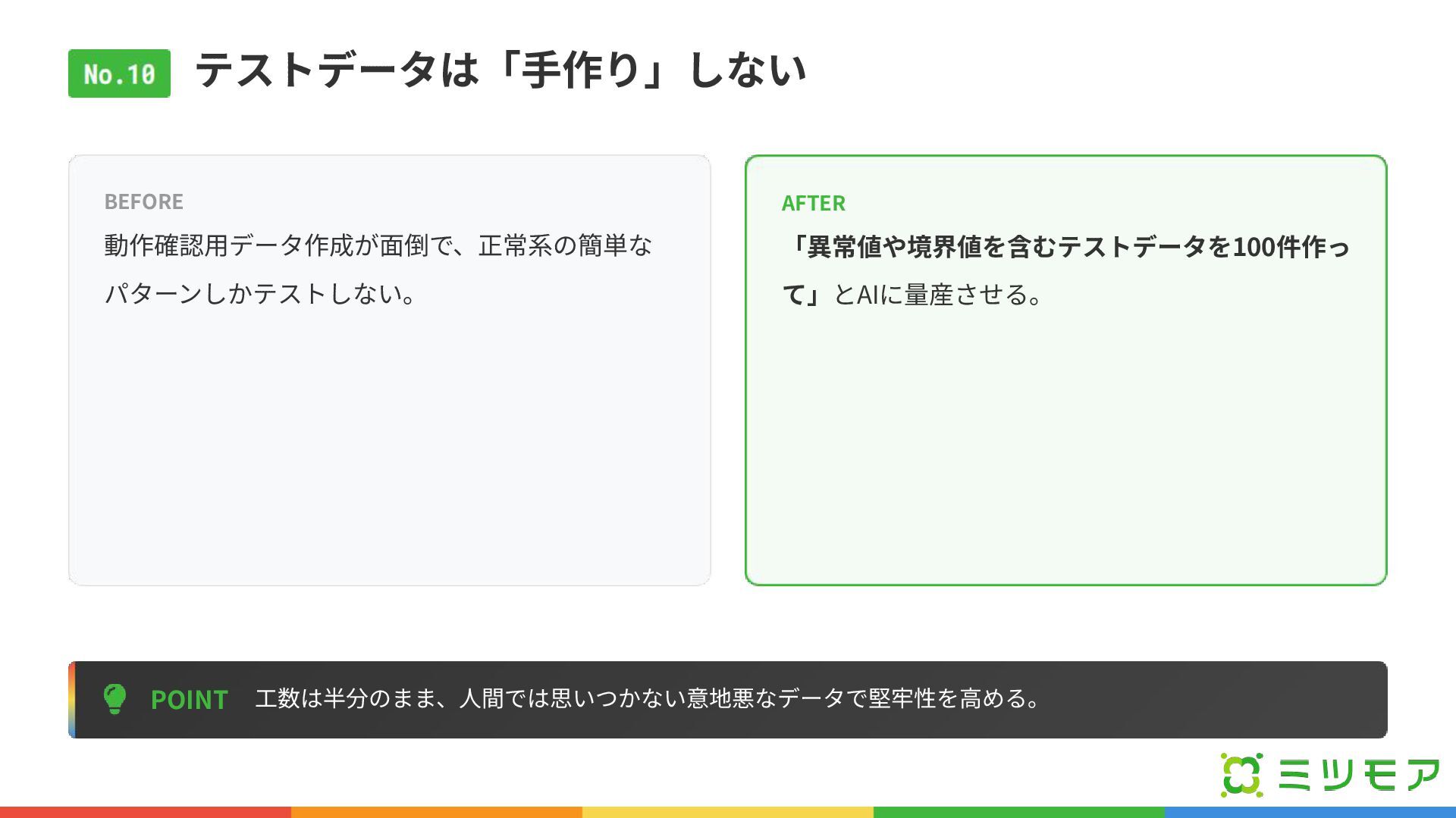 テストデータは「⼿作り」しない POINT ⼯数は半分のまま、⼈間では思いつかない意地悪なデータで堅牢性を⾼める。 BEFORE 動作確認⽤データ作成が⾯倒で、正常系の簡単な パターンしかテストしない。 AFTER 「異常値や境界値を含むテストデータを100件作っ て」とAIに量産させる。