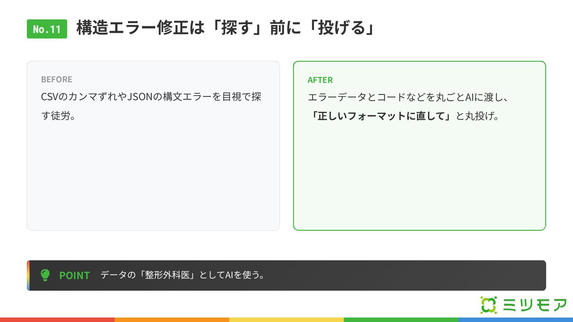 構造エラー修正は「探す」前に「投げる」 POINT データの「整形外科医」としてAIを使う。 BEFORE CSVのカンマずれやJSONの構⽂エラーを⽬視で探 す徒労。 AFTER エラーデータとコードなどを丸ごとAIに渡し、 「正しいフォーマットに直して」と丸投げ。