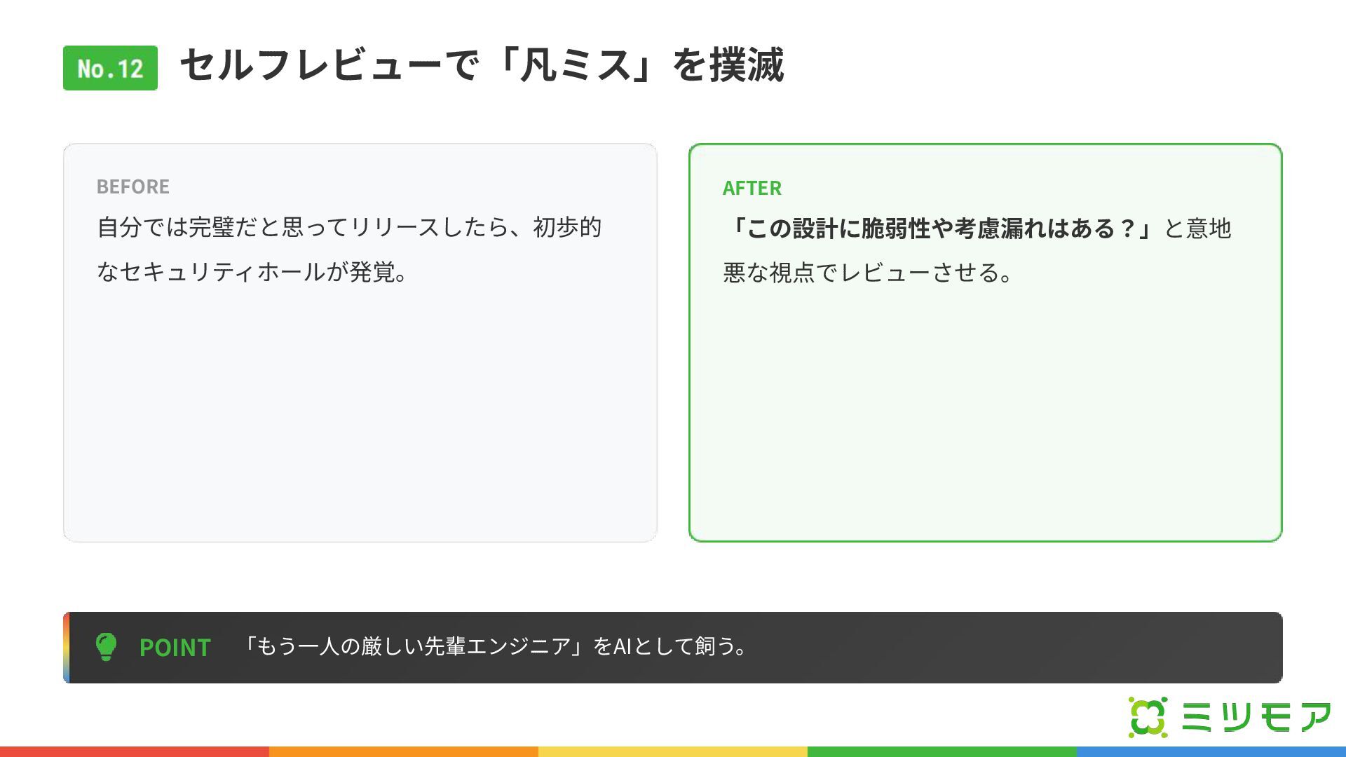 セルフレビューで「凡ミス」を撲滅 POINT 「もう⼀⼈の厳しい先輩エンジニア」をAIとして飼う。 BEFORE ⾃分では完璧だと思ってリリースしたら、初歩的 なセキュリティホールが発覚。 AFTER 「この設計に脆弱性や考慮漏れはある?」と意地 悪な視点でレビューさせる。