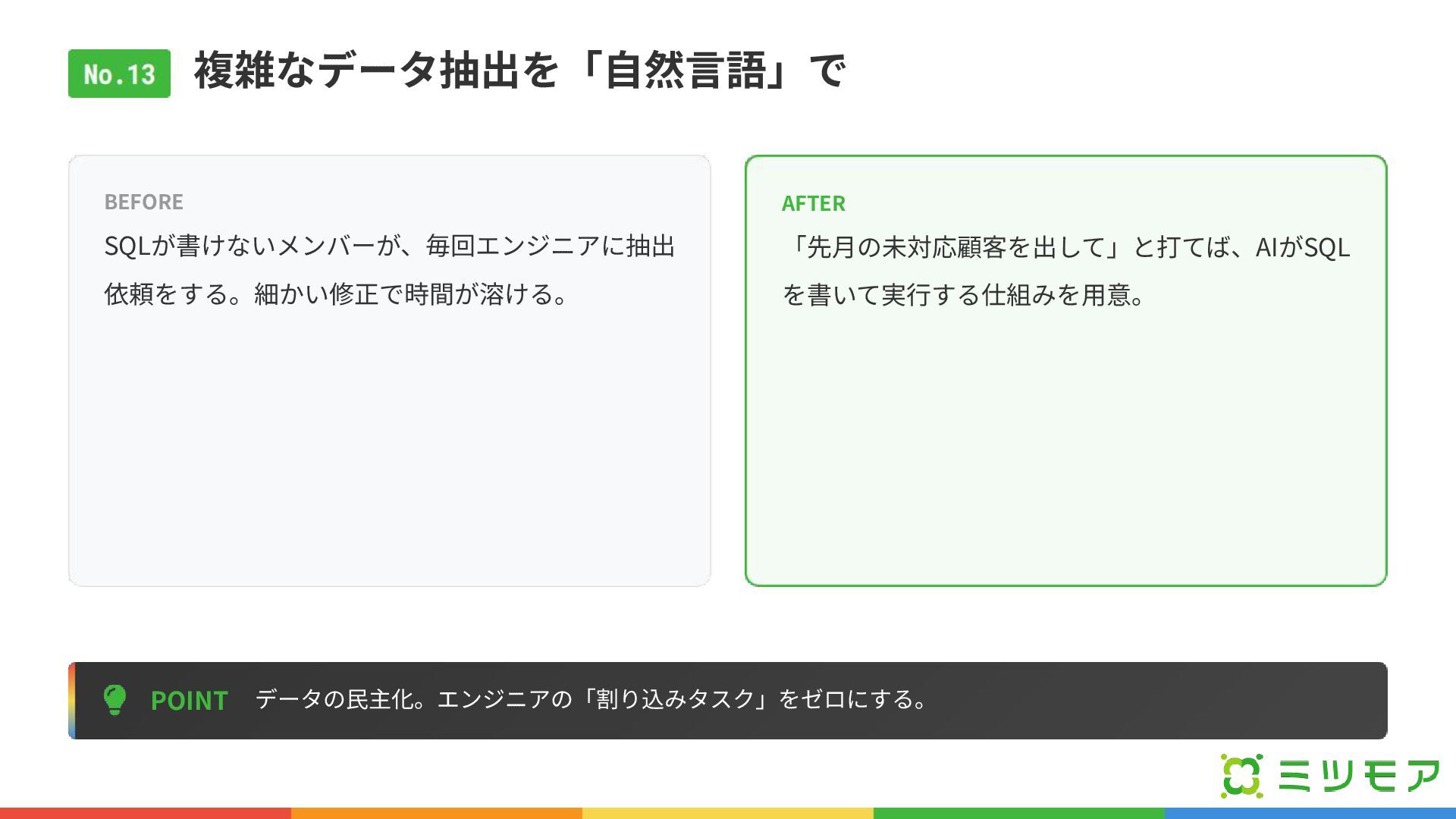 複雑なデータ抽出を「⾃然⾔語」で POINT データの⺠主化。エンジニアの「割り込みタスク」をゼロにする。 BEFORE SQLが書けないメンバーが、毎回エンジニアに抽出 依頼をする。細かい修正で時間が溶ける。 AFTER 「先⽉の未対応顧客を出して」と打てば、AIがSQL を書いて実⾏する仕組みを⽤意。
