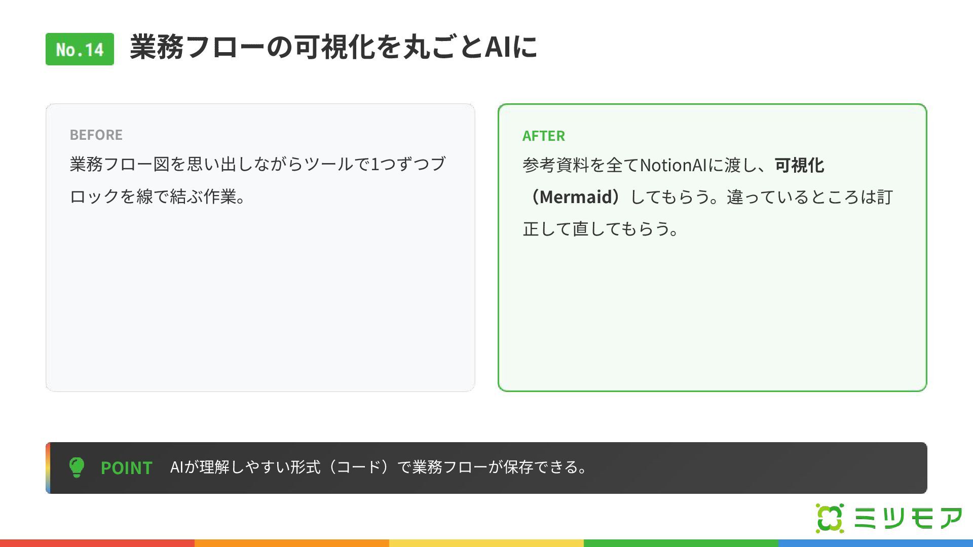 業務フローの可視化を丸ごとAIに POINT AIが理解しやすい形式(コード)で業務フローが保存できる。 BEFORE 業務フロー図を思い出しながらツールで1つずつブ ロックを線で結ぶ作業。 AFTER 参考資料を全てNotionAIに渡し、可視化 (Mermaid)してもらう。違っているところは訂 正して直してもらう。
