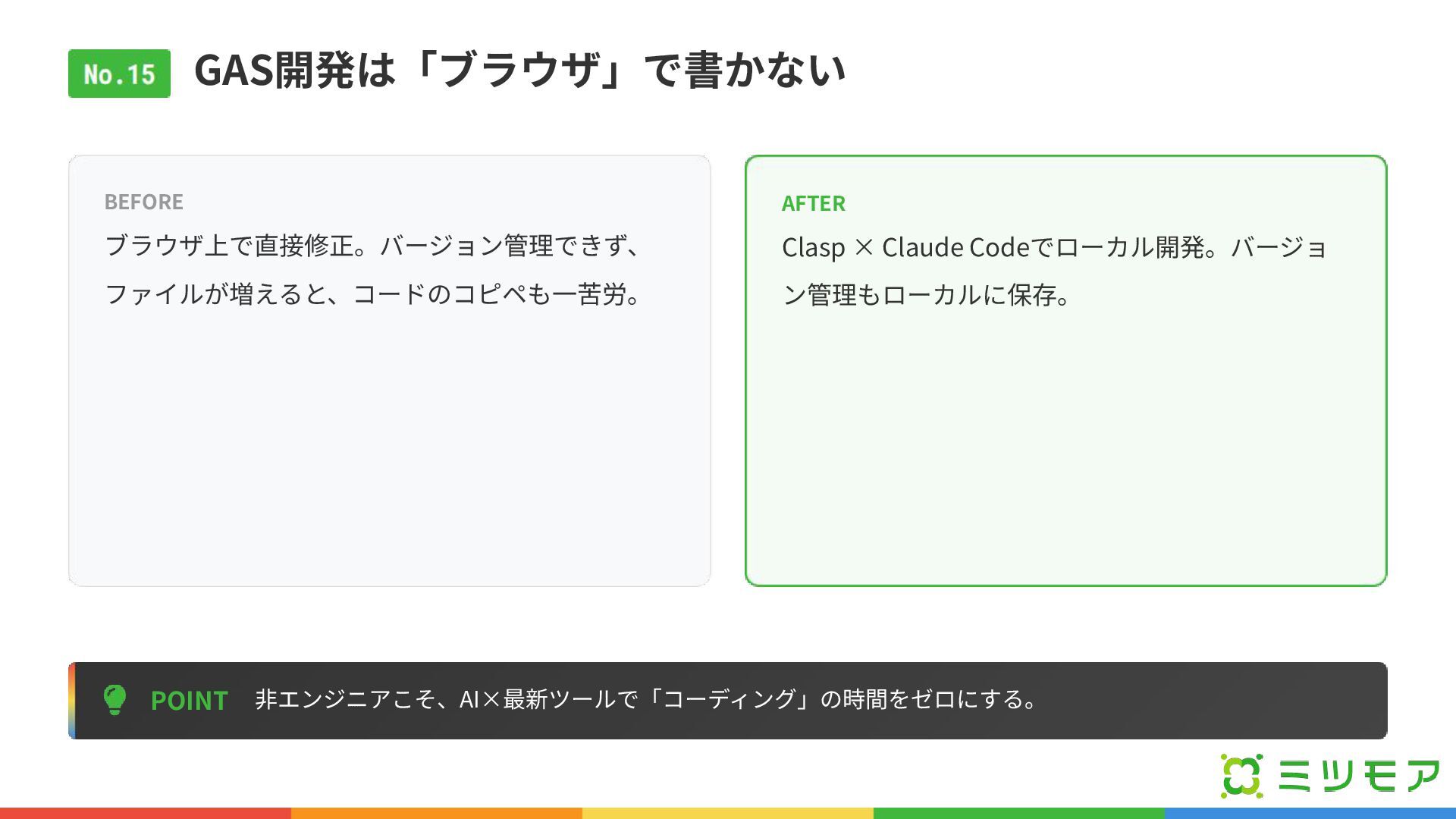 GAS開発は「ブラウザ」で書かない POINT ⾮エンジニアこそ、AI×最新ツールで「コーディング」の時間をゼロにする。 BEFORE ブラウザ上で直接修正。バージョン管理できず、 ファイルが増えると、コードのコピペも⼀苦労。 AFTER Clasp × Claude