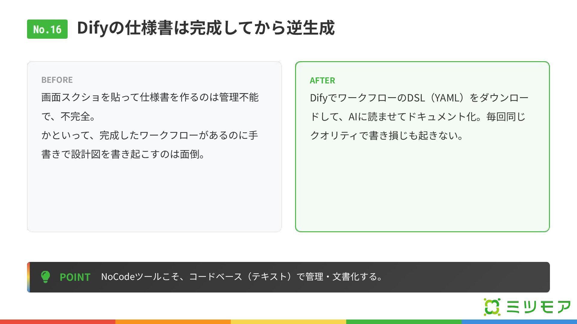 Difyの仕様書は完成してから逆⽣成 POINT NoCodeツールこそ、コードベース(テキスト)で管理‧⽂書化する。 BEFORE 画⾯スクショを貼って仕様書を作るのは管理不能 で、不完全。 かといって、完成したワークフローがあるのに⼿ 書きで設計図を書き起こすのは⾯倒。 AFTER DifyでワークフローのDSL(YAML)をダウンロー