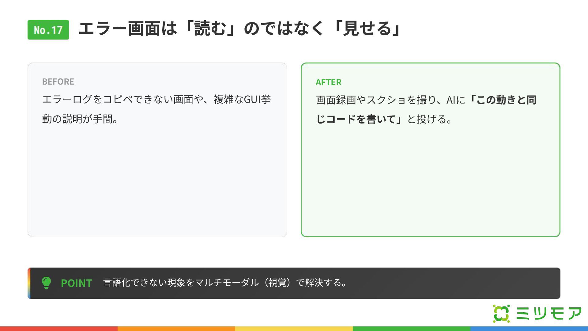 エラー画⾯は「読む」のではなく「⾒せる」 POINT ⾔語化できない現象をマルチモーダル(視覚)で解決する。 BEFORE エラーログをコピペできない画⾯や、複雑なGUI挙 動の説明が⼿間。 AFTER 画⾯録画やスクショを撮り、AIに「この動きと同 じコードを書いて」と投げる。