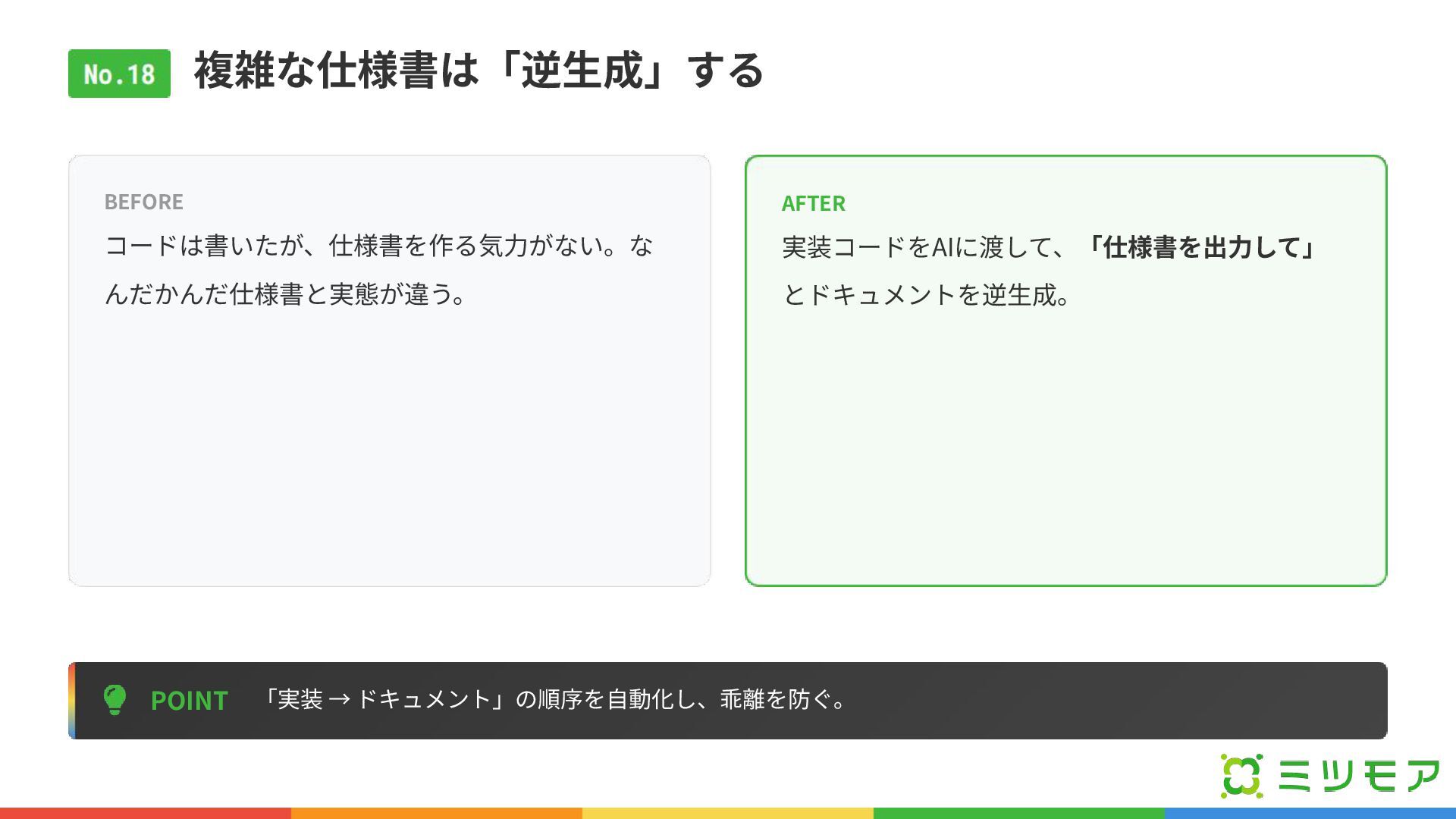 複雑な仕様書は「逆⽣成」する POINT 「実装 → ドキュメント」の順序を⾃動化し、乖離を防ぐ。 BEFORE コードは書いたが、仕様書を作る気⼒がない。な んだかんだ仕様書と実態が違う。 AFTER 実装コードをAIに渡して、「仕様書を出⼒して」
