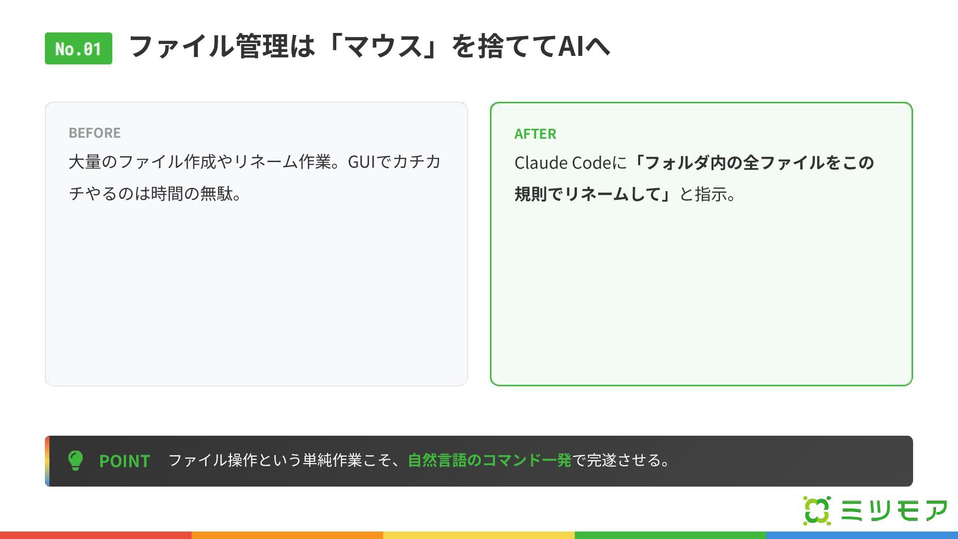 ファイル管理は「マウス」を捨ててAIへ POINT ファイル操作という単純作業こそ、⾃然⾔語のコマンド⼀発で完遂させる。 BEFORE ⼤量のファイル作成やリネーム作業。GUIでカチカ チやるのは時間の無駄。 AFTER Claude Codeに「フォルダ内の全ファイルをこの 規則でリネームして」と指⽰。