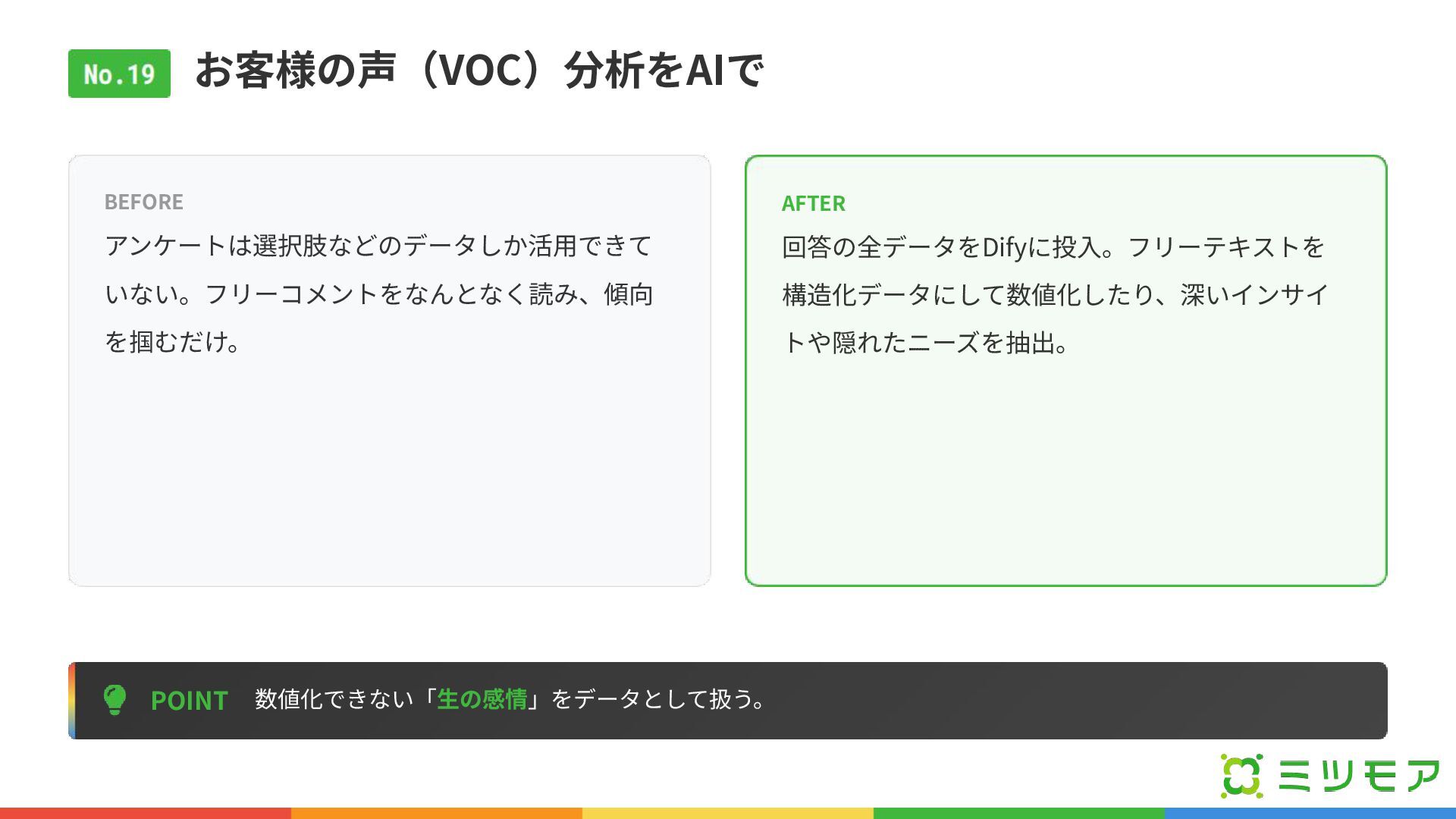 お客様の声(VOC)分析をAIで POINT 数値化できない「⽣の感情」をデータとして扱う。 BEFORE アンケートは選択肢などのデータしか活⽤できて いない。フリーコメントをなんとなく読み、傾向 を掴むだけ。 AFTER 回答の全データをDifyに投⼊。フリーテキストを 構造化データにして数値化したり、深いインサイ