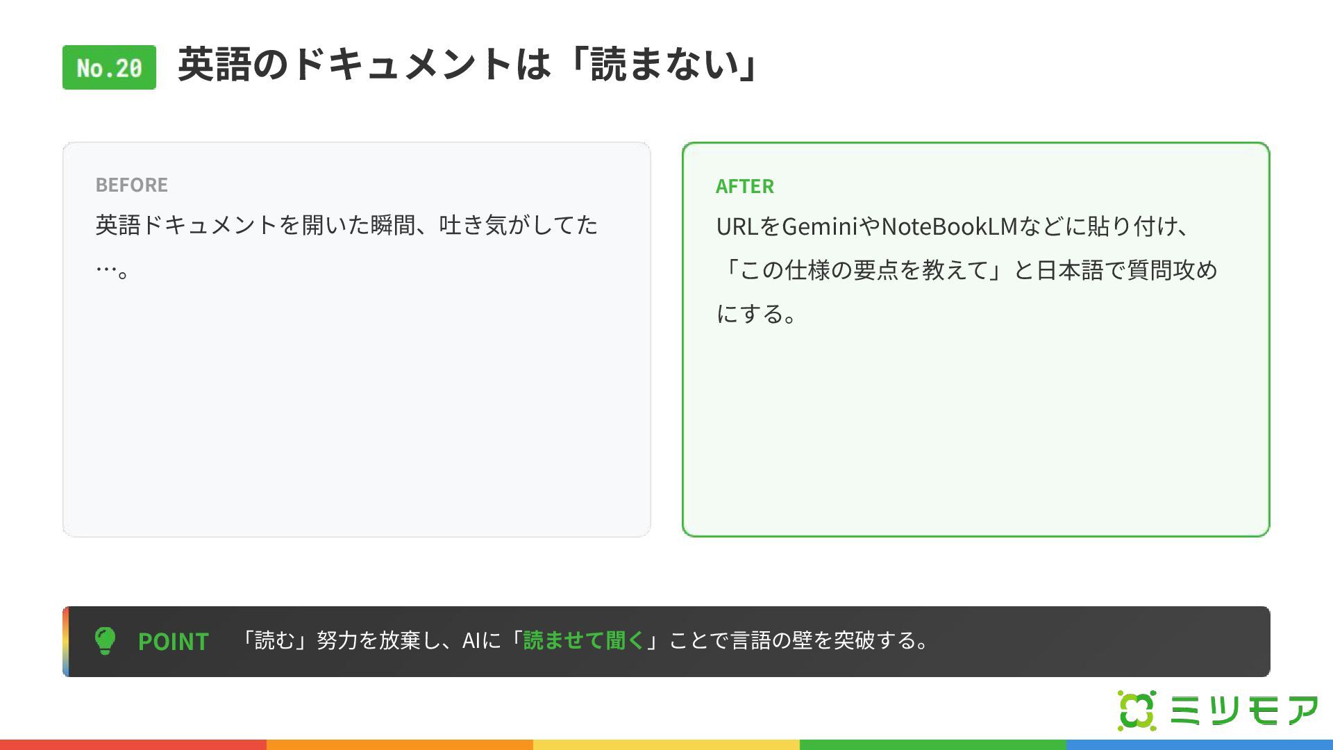 英語のドキュメントは「読まない」 POINT 「読む」努⼒を放棄し、AIに「読ませて聞く」ことで⾔語の壁を突破する。 BEFORE 英語ドキュメントを開いた瞬間、吐き気がしてた …。 AFTER URLをGeminiやNoteBookLMなどに貼り付け、 「この仕様の要点を教えて」と⽇本語で質問攻め にする。