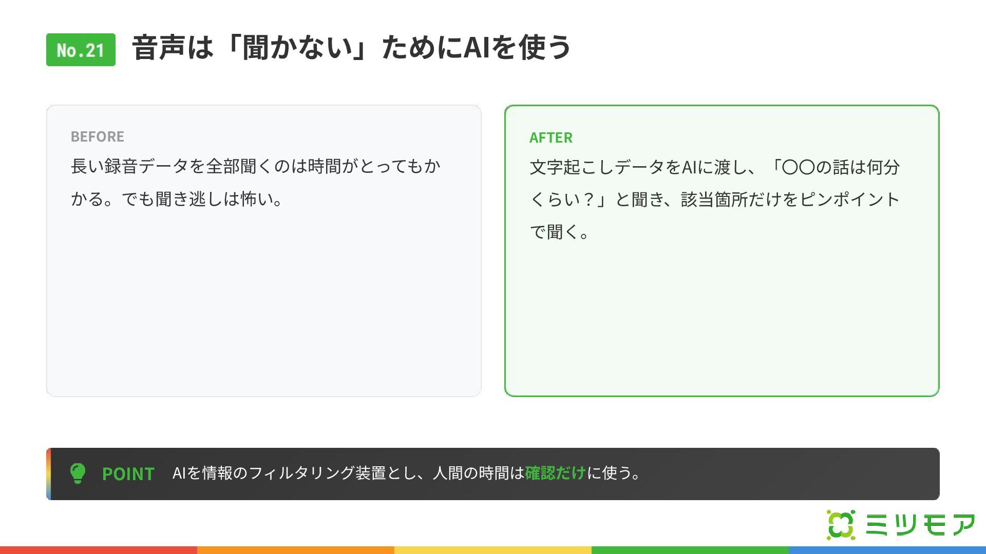 ⾳声は「聞かない」ためにAIを使う POINT AIを情報のフィルタリング装置とし、⼈間の時間は確認だけに使う。 BEFORE ⻑い録⾳データを全部聞くのは時間がとってもか かる。でも聞き逃しは怖い。 AFTER ⽂字起こしデータをAIに渡し、「〇〇の話は何分 くらい?」と聞き、該当箇所だけをピンポイント で聞く。