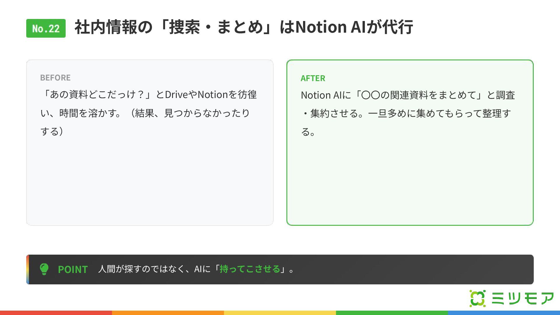 社内情報の「捜索‧まとめ」はNotion AIが代⾏ POINT ⼈間が探すのではなく、AIに「持ってこさせる」。 BEFORE 「あの資料どこだっけ?」とDriveやNotionを彷徨 い、時間を溶かす。(結果、⾒つからなかったり する) AFTER Notion