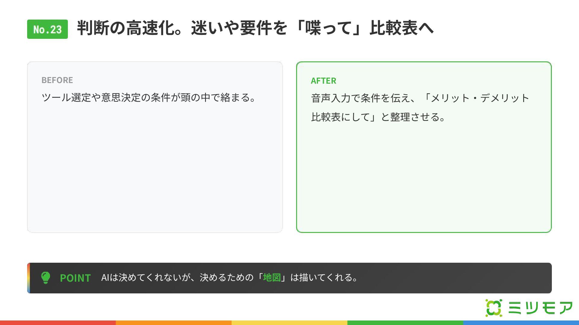判断の⾼速化。迷いや要件を「喋って」⽐較表へ POINT AIは決めてくれないが、決めるための「地図」は描いてくれる。 BEFORE ツール選定や意思決定の条件が頭の中で絡まる。 AFTER ⾳声⼊⼒で条件を伝え、「メリット‧デメリット ⽐較表にして」と整理させる。