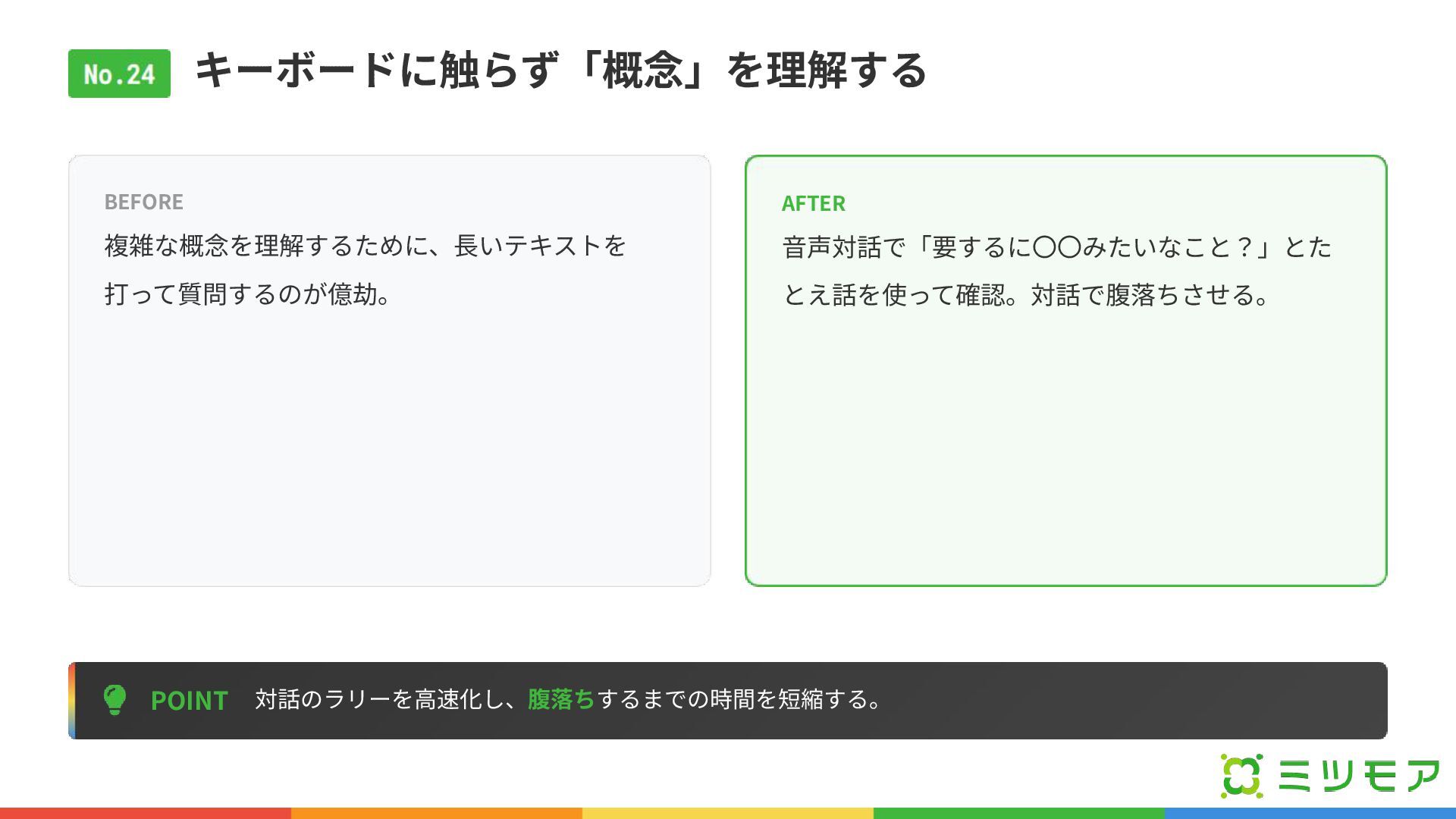 キーボードに触らず「概念」を理解する POINT 対話のラリーを⾼速化し、腹落ちするまでの時間を短縮する。 BEFORE 複雑な概念を理解するために、⻑いテキストを 打って質問するのが億劫。 AFTER ⾳声対話で「要するに〇〇みたいなこと?」とた とえ話を使って確認。対話で腹落ちさせる。