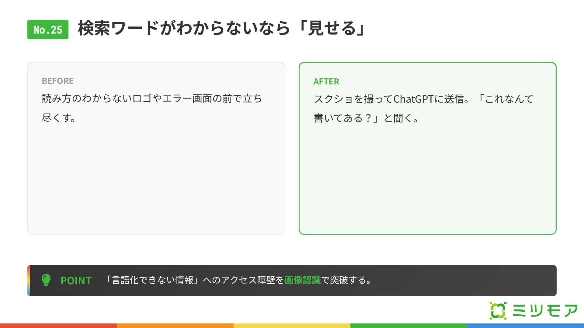 検索ワードがわからないなら「⾒せる」 POINT 「⾔語化できない情報」へのアクセス障壁を画像認識で突破する。 BEFORE 読み⽅のわからないロゴやエラー画⾯の前で⽴ち 尽くす。 AFTER スクショを撮ってChatGPTに送信。「これなんて 書いてある?」と聞く。