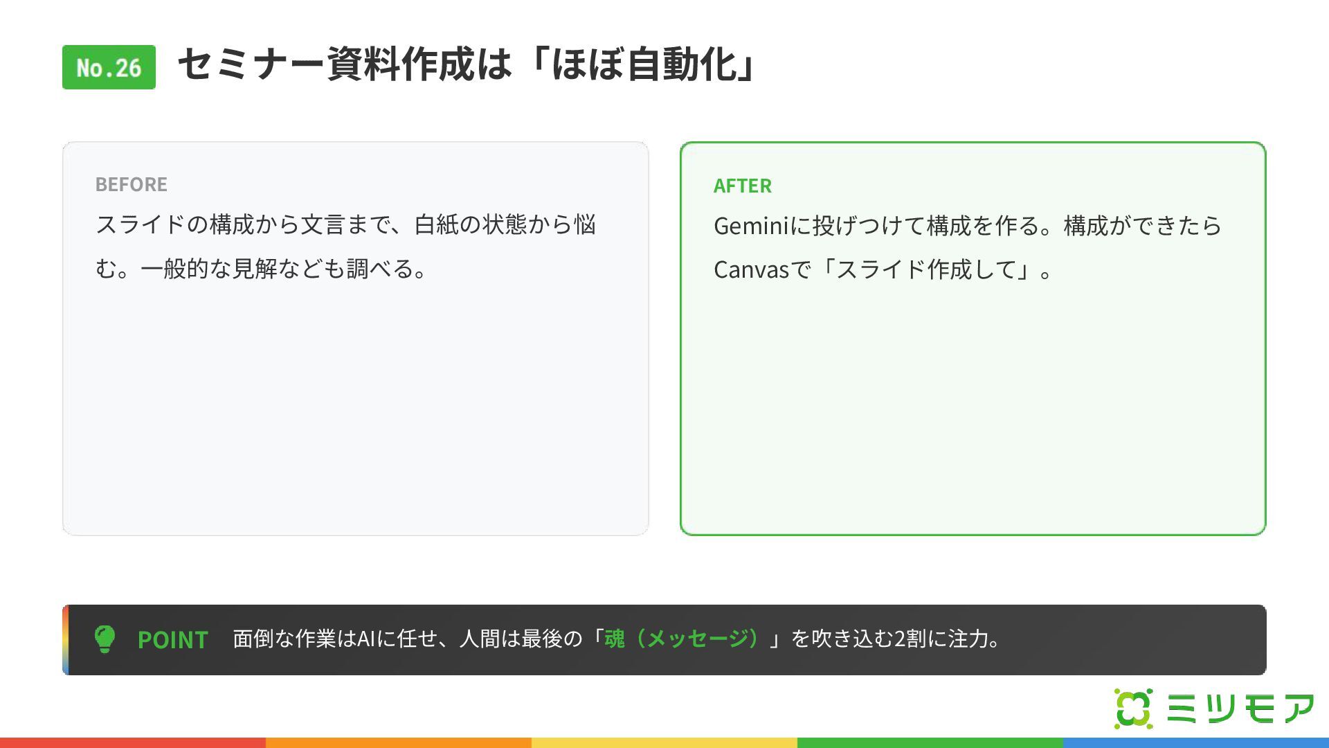 セミナー資料作成は「ほぼ⾃動化」 POINT ⾯倒な作業はAIに任せ、⼈間は最後の「魂(メッセージ)」を吹き込む2割に注⼒。 BEFORE スライドの構成から⽂⾔まで、⽩紙の状態から悩 む。⼀般的な⾒解なども調べる。 AFTER Geminiに投げつけて構成を作る。構成ができたら Canvasで「スライド作成して」。