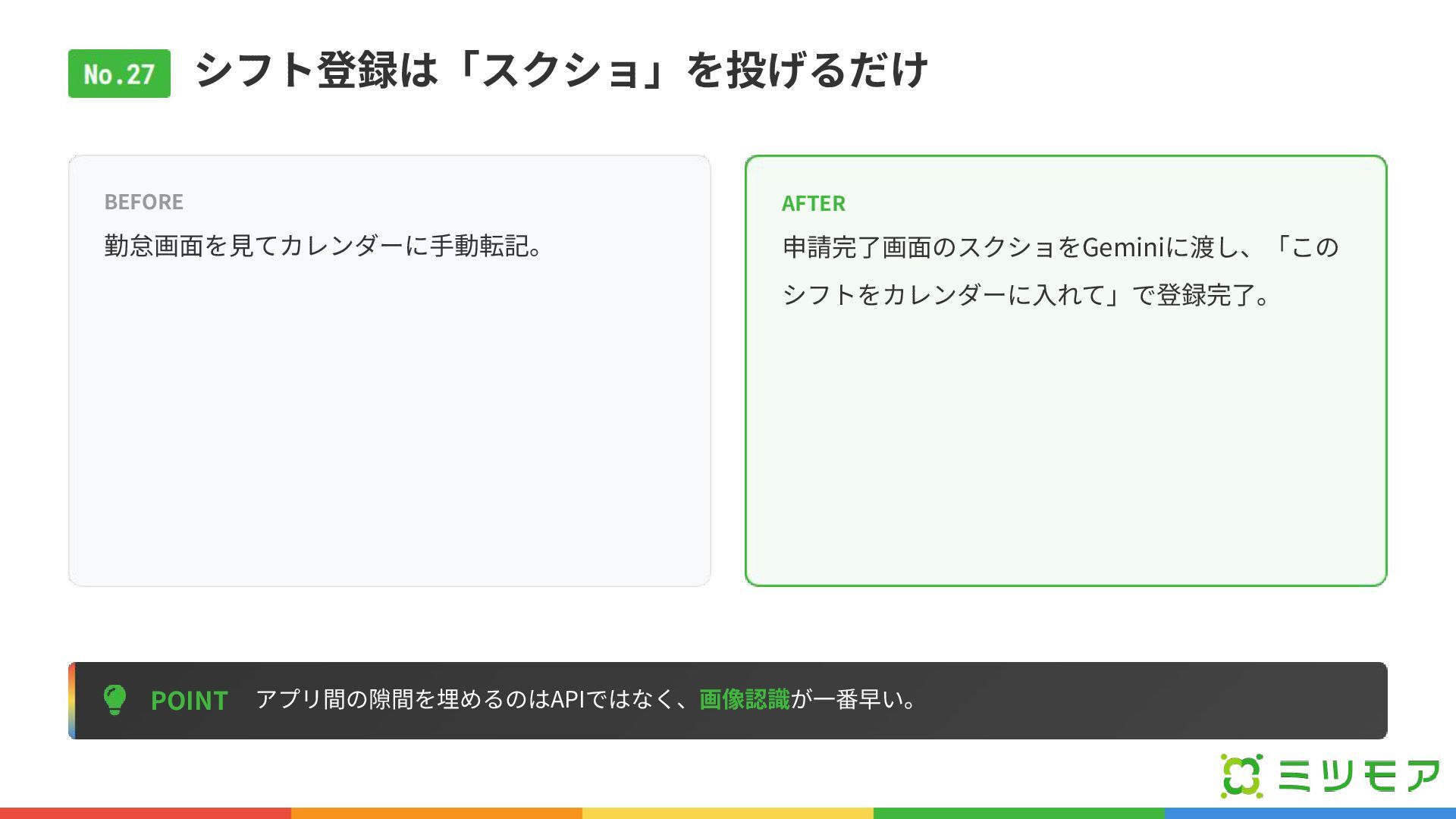 シフト登録は「スクショ」を投げるだけ POINT アプリ間の隙間を埋めるのはAPIではなく、画像認識が⼀番早い。 BEFORE 勤怠画⾯を⾒てカレンダーに⼿動転記。 AFTER 申請完了画⾯のスクショをGeminiに渡し、「この シフトをカレンダーに⼊れて」で登録完了。