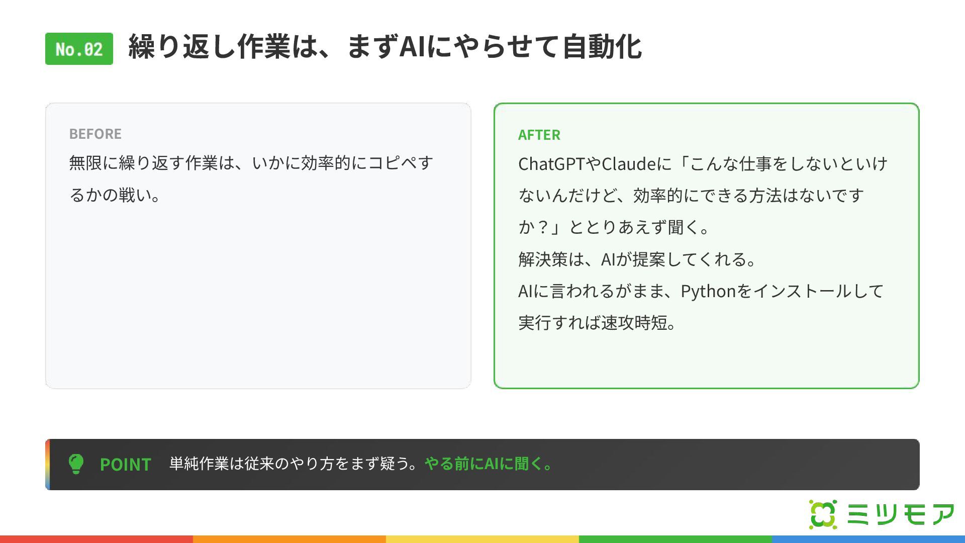 繰り返し作業は、まずAIにやらせて⾃動化 POINT 単純作業は従来のやり⽅をまず疑う。やる前にAIに聞く。 BEFORE 無限に繰り返す作業は、いかに効率的にコピペす るかの戦い。 AFTER ChatGPTやClaudeに「こんな仕事をしないといけ ないんだけど、効率的にできる⽅法はないです か?」ととりあえず聞く。