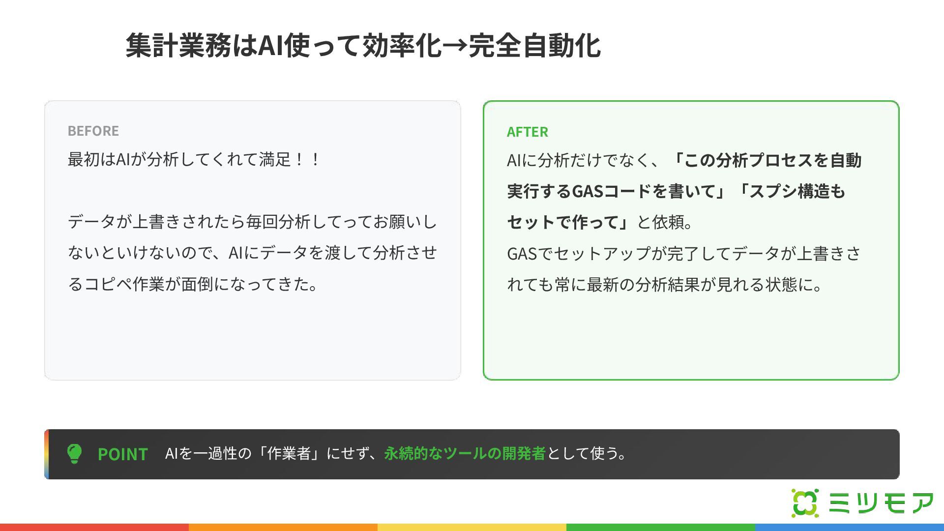 集計業務はAI使って効率化→完全⾃動化 POINT AIを⼀過性の「作業者」にせず、永続的なツールの開発者として使う。 BEFORE 最初はAIが分析してくれて満⾜!! データが上書きされたら毎回分析してってお願いし ないといけないので、AIにデータを渡して分析させ るコピペ作業が⾯倒になってきた。 AFTER AIに分析だけでなく、「この分析プロセスを⾃動