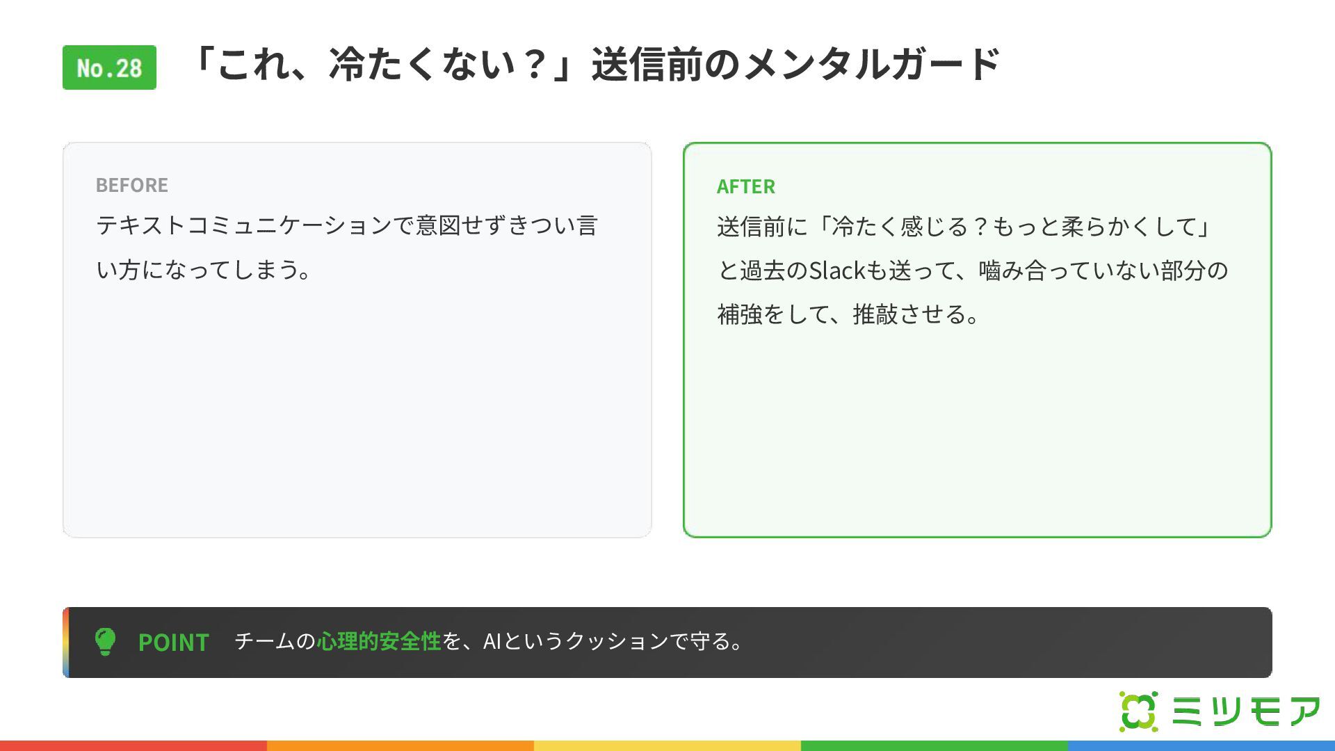 「これ、冷たくない?」送信前のメンタルガード POINT チームの⼼理的安全性を、AIというクッションで守る。 BEFORE テキストコミュニケーションで意図せずきつい⾔ い⽅になってしまう。 AFTER 送信前に「冷たく感じる?もっと柔らかくして」 と過去のSlackも送って、嚙み合っていない部分の 補強をして、推敲させる。