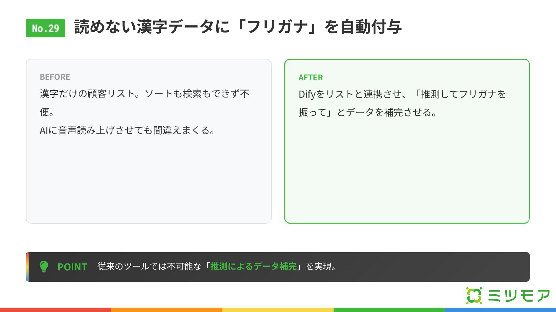 読めない漢字データに「フリガナ」を⾃動付与 POINT 従来のツールでは不可能な「推測によるデータ補完」を実現。 BEFORE 漢字だけの顧客リスト。ソートも検索もできず不 便。 AIに⾳声読み上げさせても間違えまくる。 AFTER Difyをリストと連携させ、「推測してフリガナを 振って」とデータを補完させる。