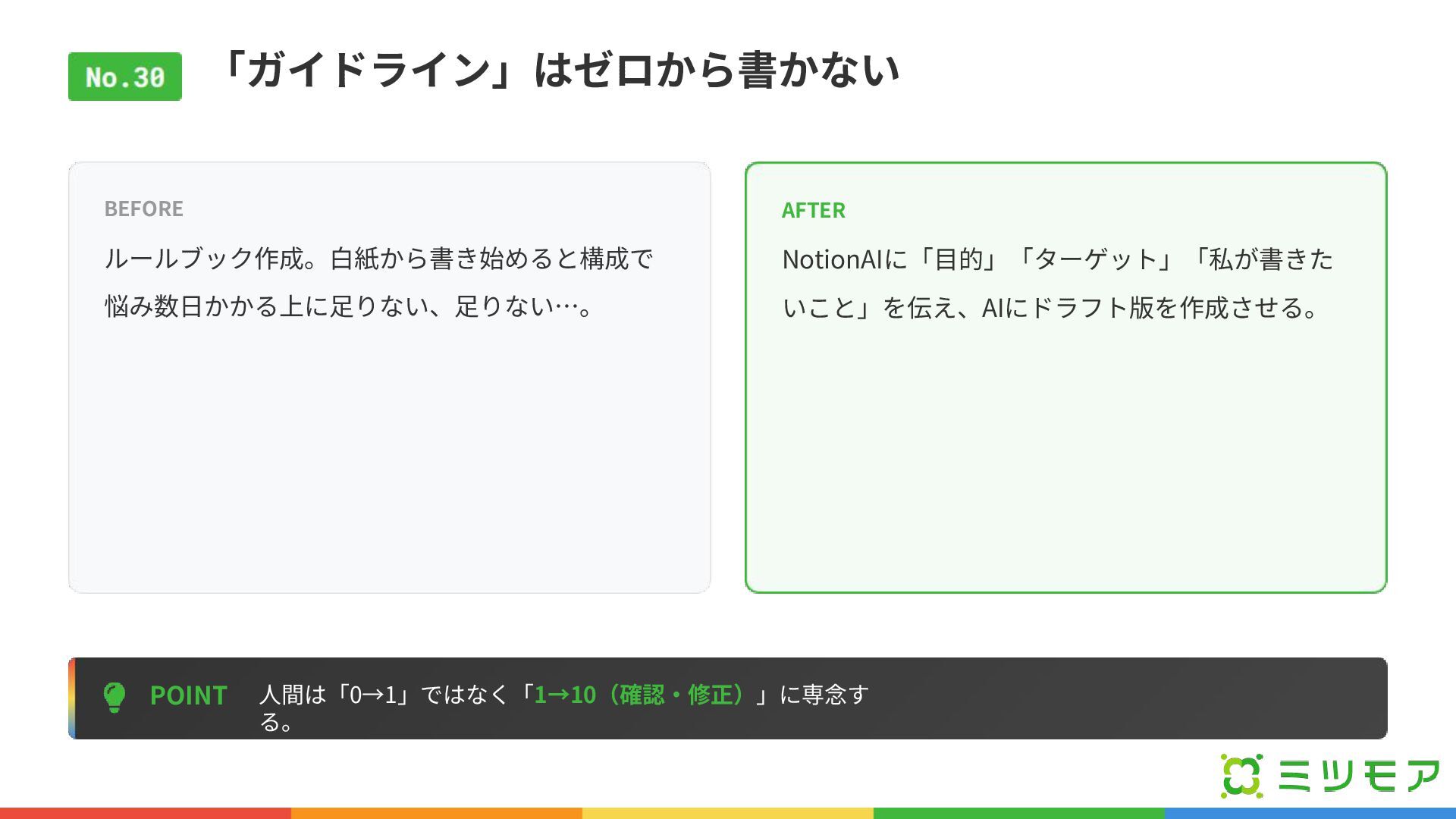 「ガイドライン」はゼロから書かない POINT ⼈間は「0→1」ではなく「1→10(確認‧修正)」に専念す る。 BEFORE ルールブック作成。⽩紙から書き始めると構成で 悩み数⽇かかる上に⾜りない、⾜りない…。 AFTER NotionAIに「⽬的」「ターゲット」「私が書きた いこと」を伝え、AIにドラフト版を作成させる。