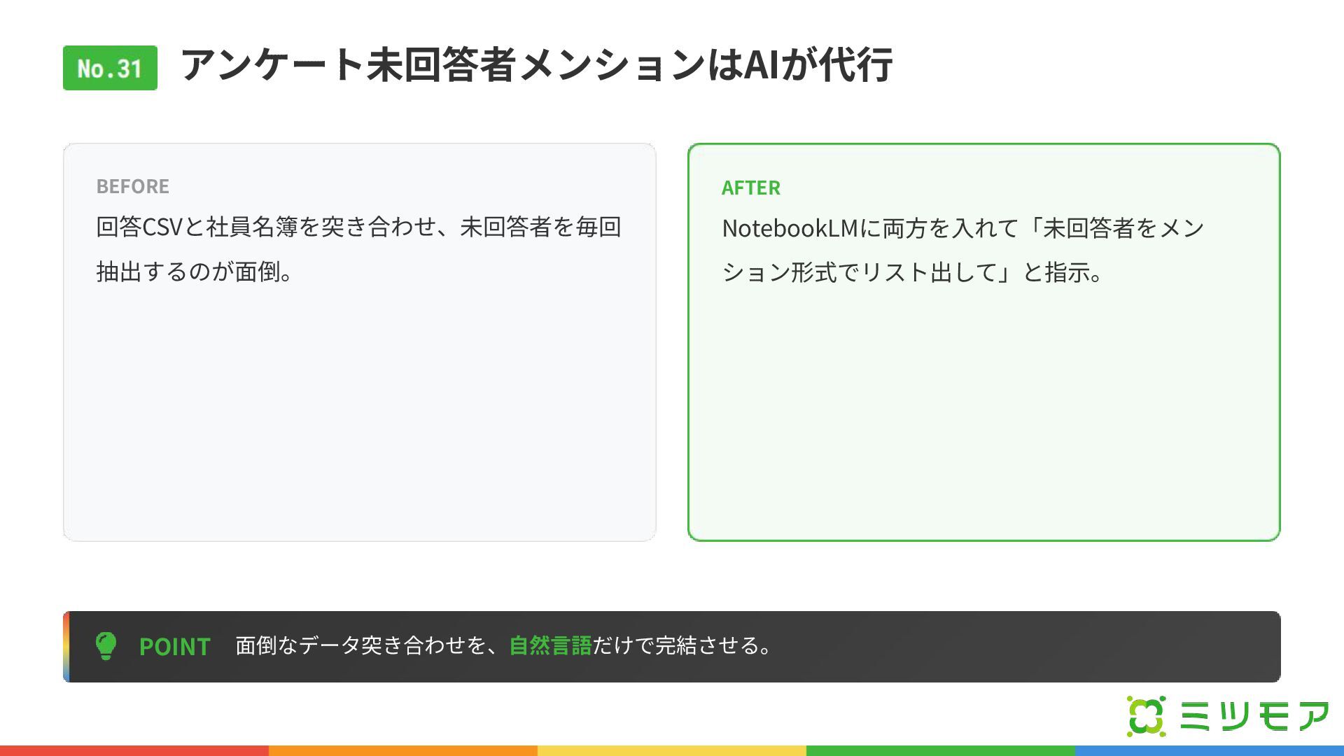 アンケート未回答者メンションはAIが代⾏ POINT ⾯倒なデータ突き合わせを、⾃然⾔語だけで完結させる。 BEFORE 回答CSVと社員名簿を突き合わせ、未回答者を毎回 抽出するのが⾯倒。 AFTER NotebookLMに両⽅を⼊れて「未回答者をメン ション形式でリスト出して」と指⽰。