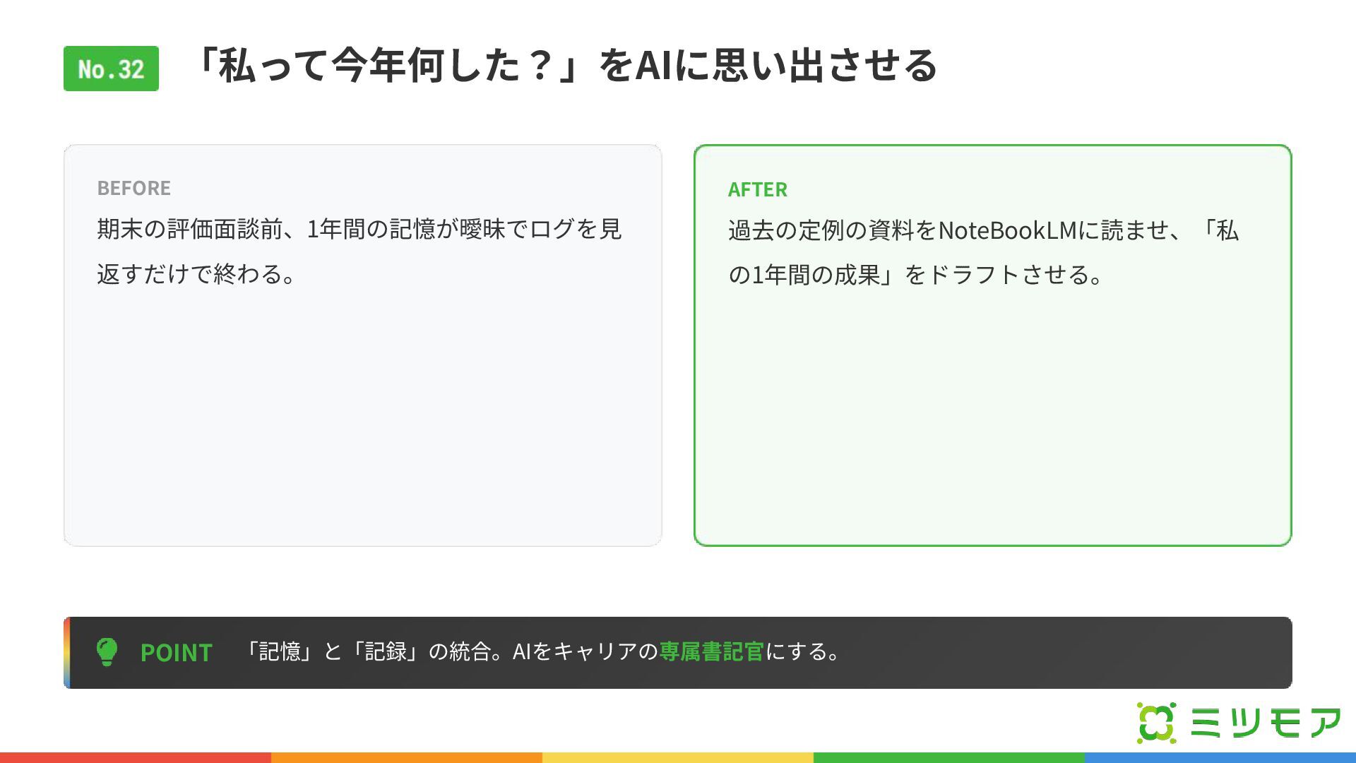 「私って今年何した?」をAIに思い出させる POINT 「記憶」と「記録」の統合。AIをキャリアの専属書記官にする。 BEFORE 期末の評価⾯談前、1年間の記憶が曖昧でログを⾒ 返すだけで終わる。 AFTER 過去の定例の資料をNoteBookLMに読ませ、「私 の1年間の成果」をドラフトさせる。