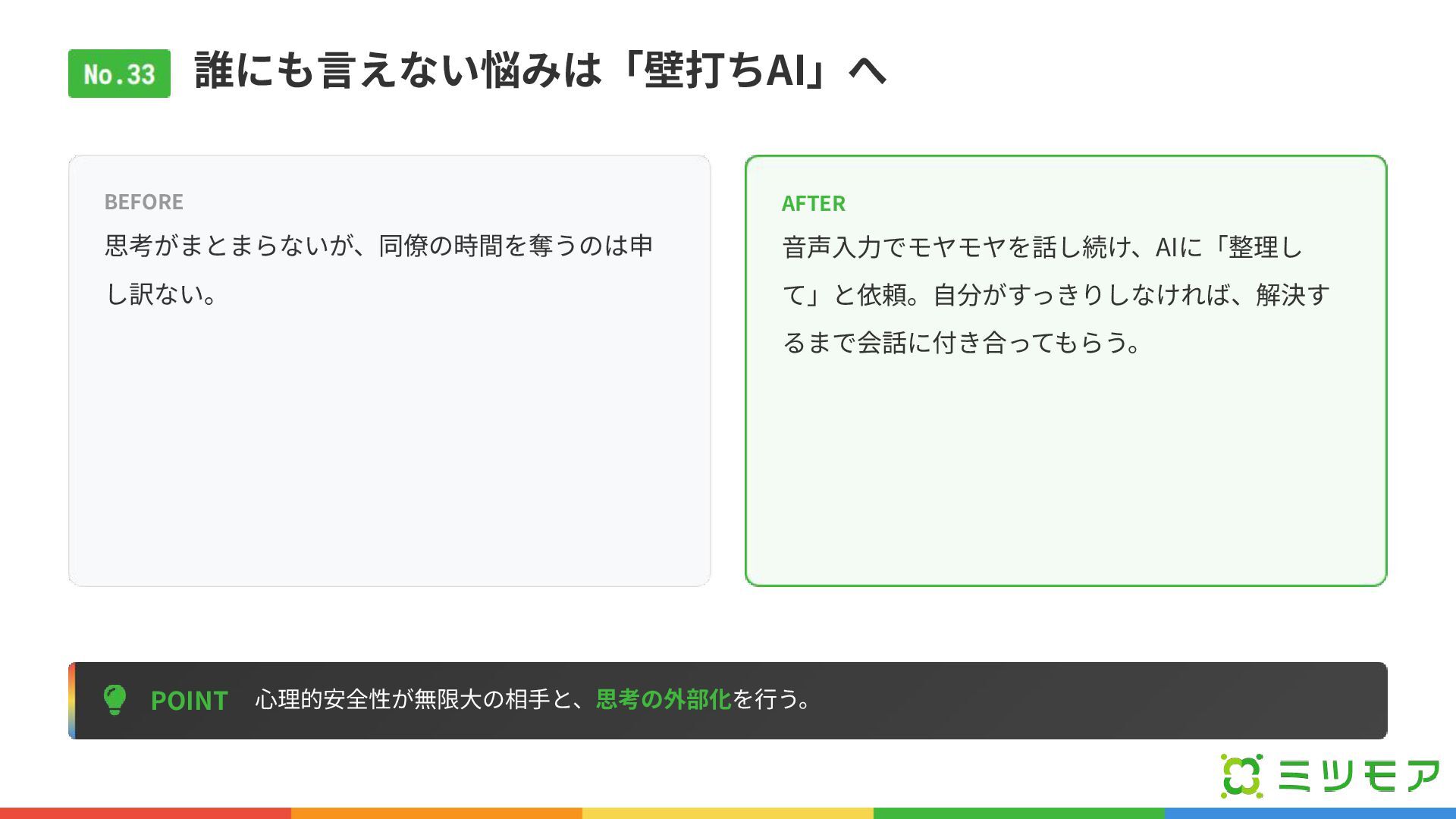 誰にも⾔えない悩みは「壁打ちAI」へ POINT ⼼理的安全性が無限⼤の相⼿と、思考の外部化を⾏う。 BEFORE 思考がまとまらないが、同僚の時間を奪うのは申 し訳ない。 AFTER ⾳声⼊⼒でモヤモヤを話し続け、AIに「整理し て」と依頼。⾃分がすっきりしなければ、解決す るまで会話に付き合ってもらう。