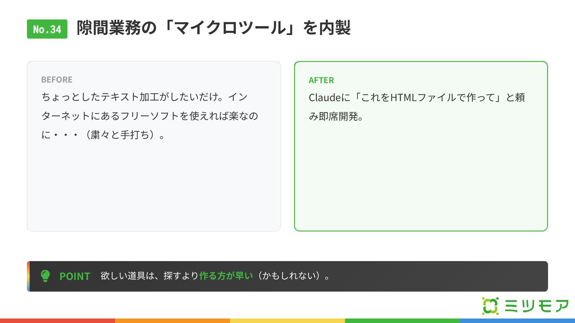 隙間業務の「マイクロツール」を内製 POINT 欲しい道具は、探すより作る⽅が早い(かもしれない)。 BEFORE ちょっとしたテキスト加⼯がしたいだけ。イン ターネットにあるフリーソフトを使えれば楽なの に‧‧‧(粛々と⼿打ち)。 AFTER Claudeに「これをHTMLファイルで作って」と頼 み即席開発。