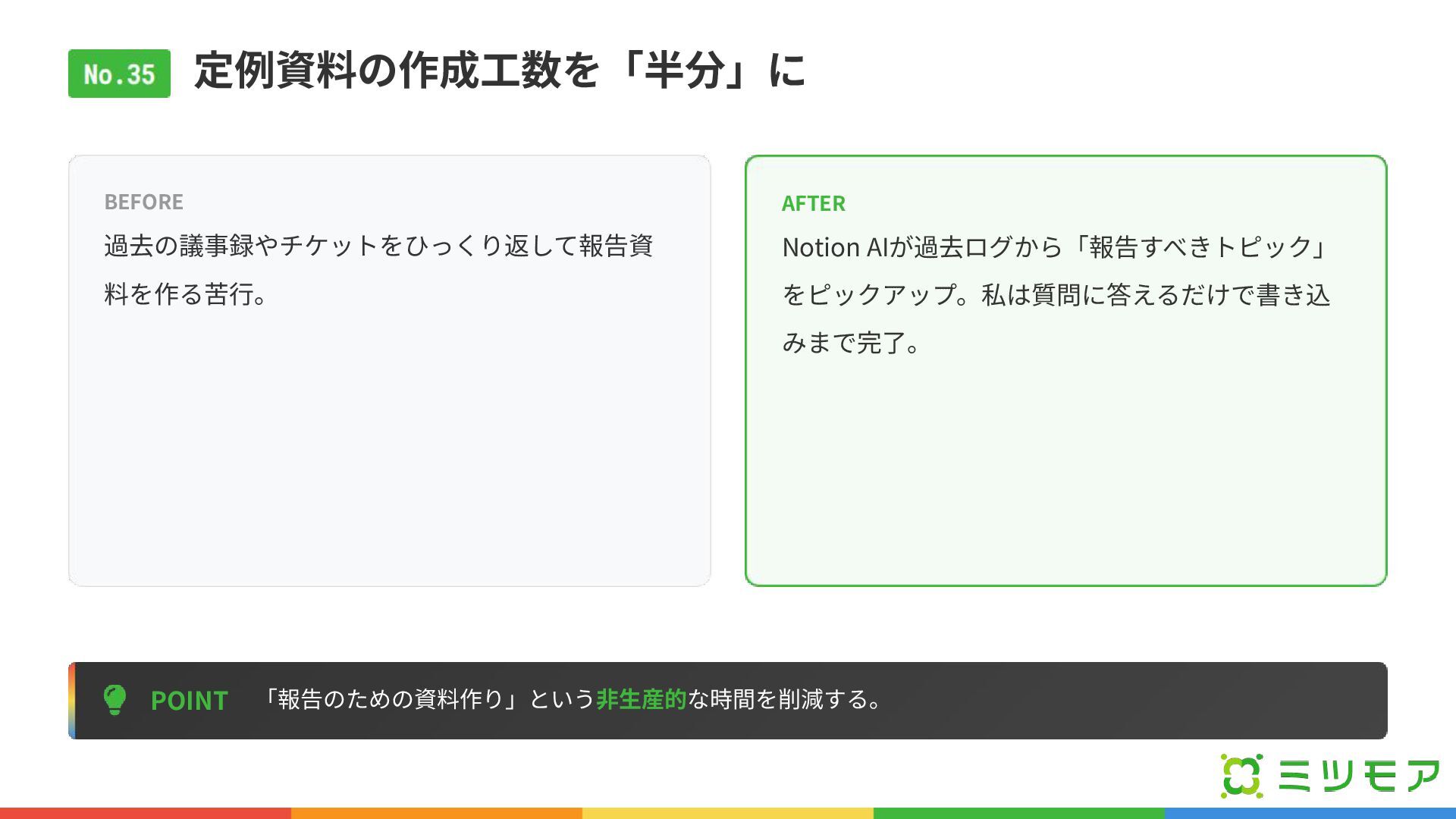 定例資料の作成⼯数を「半分」に POINT 「報告のための資料作り」という⾮⽣産的な時間を削減する。 BEFORE 過去の議事録やチケットをひっくり返して報告資 料を作る苦⾏。 AFTER Notion AIが過去ログから「報告すべきトピック」 をピックアップ。私は質問に答えるだけで書き込