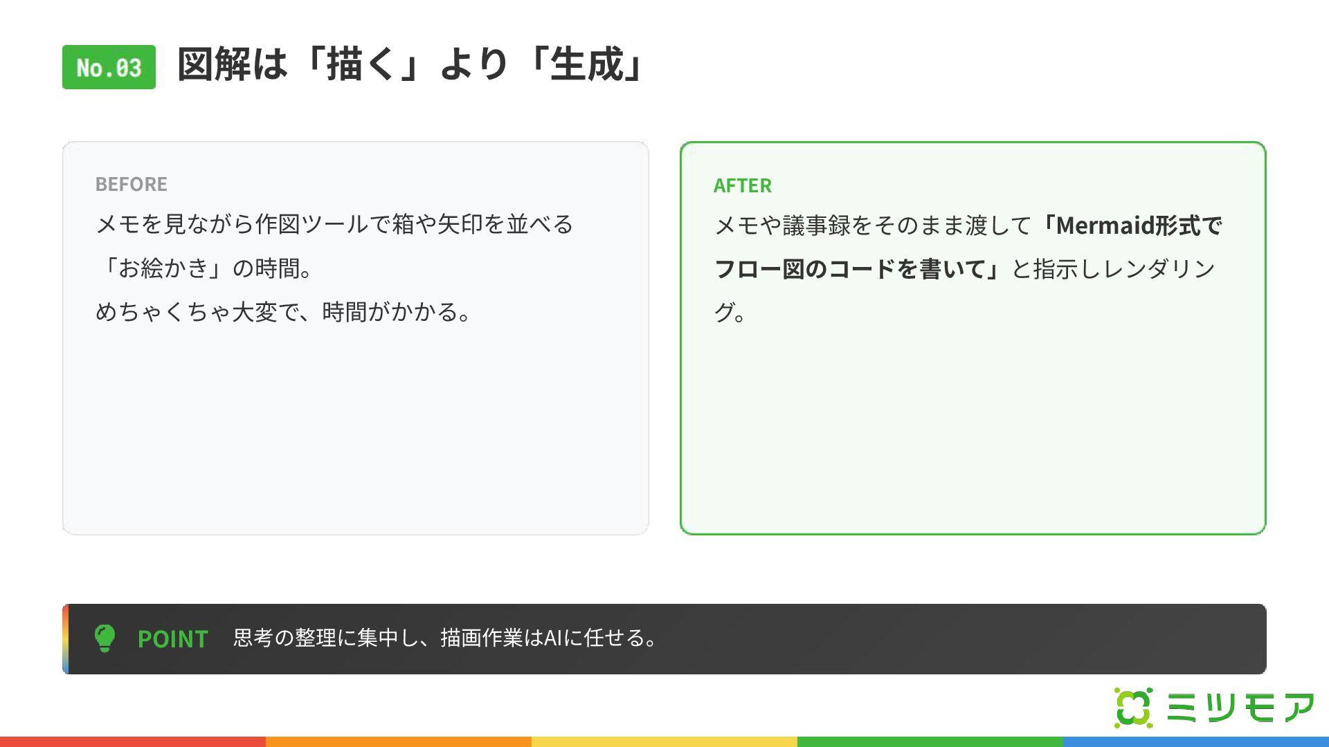 図解は「描く」より「⽣成」 POINT 思考の整理に集中し、描画作業はAIに任せる。 BEFORE メモを⾒ながら作図ツールで箱や⽮印を並べる 「お絵かき」の時間。 めちゃくちゃ⼤変で、時間がかかる。 AFTER メモや議事録をそのまま渡して「Mermaid形式で フロー図のコードを書いて」と指⽰しレンダリン