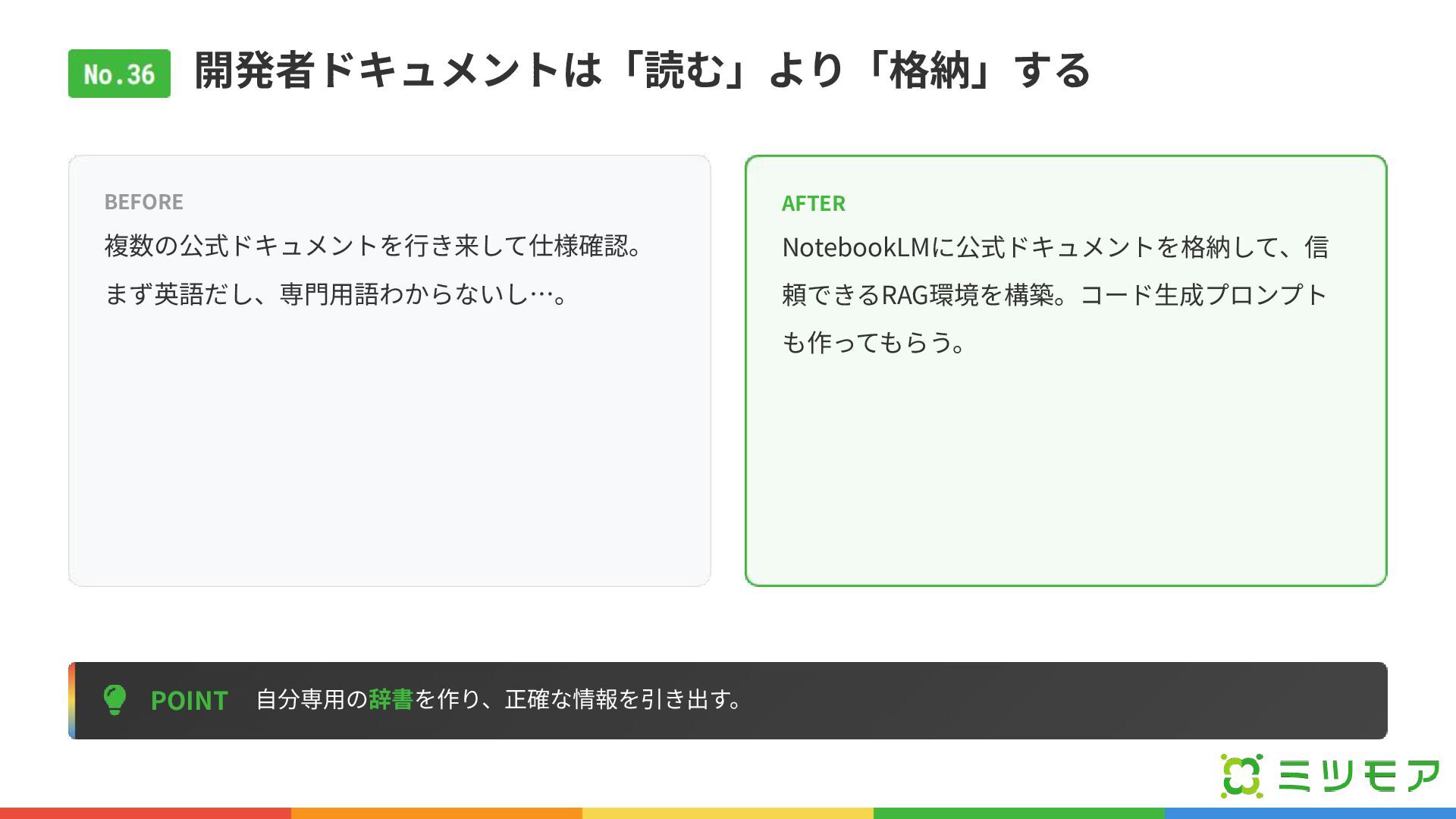 開発者ドキュメントは「読む」より「格納」する POINT ⾃分専⽤の辞書を作り、正確な情報を引き出す。 BEFORE 複数の公式ドキュメントを⾏き来して仕様確認。 まず英語だし、専⾨⽤語わからないし…。 AFTER NotebookLMに公式ドキュメントを格納して、信 頼できるRAG環境を構築。コード⽣成プロンプト も作ってもらう。