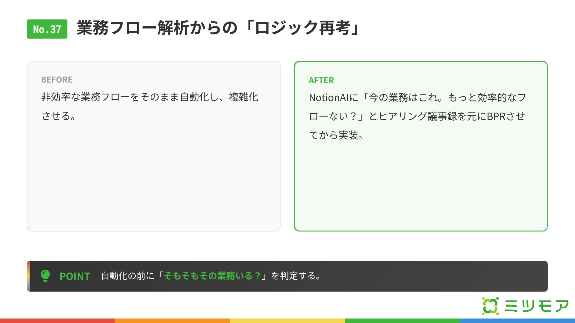業務フロー解析からの「ロジック再考」 POINT ⾃動化の前に「そもそもその業務いる?」を判定する。 BEFORE ⾮効率な業務フローをそのまま⾃動化し、複雑化 させる。 AFTER NotionAIに「今の業務はこれ。もっと効率的なフ ローない?」とヒアリング議事録を元にBPRさせ てから実装。