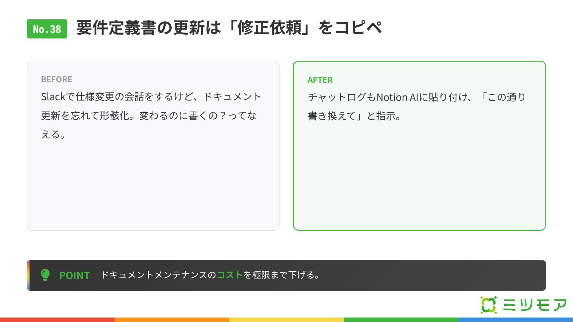 要件定義書の更新は「修正依頼」をコピペ POINT ドキュメントメンテナンスのコストを極限まで下げる。 BEFORE Slackで仕様変更の会話をするけど、ドキュメント 更新を忘れて形骸化。変わるのに書くの?ってな える。 AFTER チャットログもNotion AIに貼り付け、「この通り