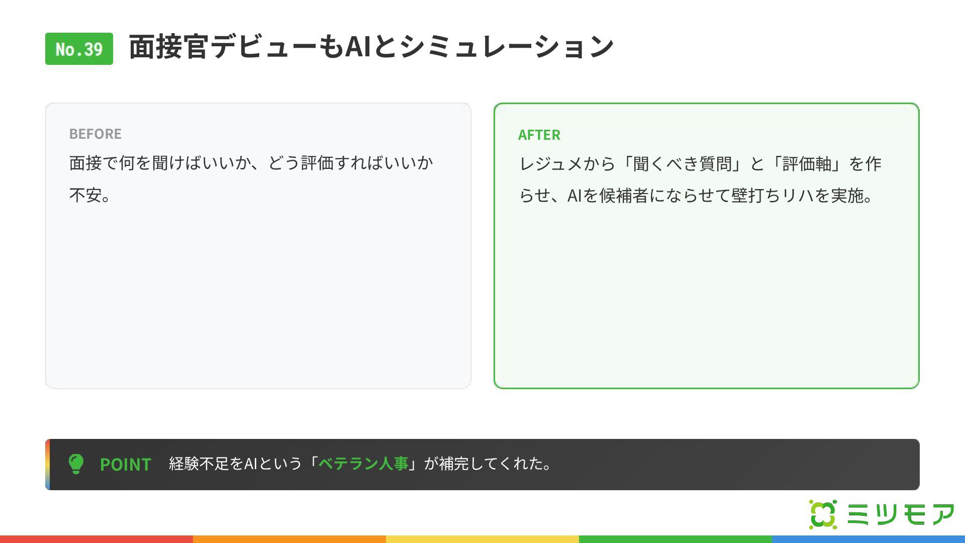⾯接官デビューもAIとシミュレーション POINT 経験不⾜をAIという「ベテラン⼈事」が補完してくれた。 BEFORE ⾯接で何を聞けばいいか、どう評価すればいいか 不安。 AFTER レジュメから「聞くべき質問」と「評価軸」を作 らせ、AIを候補者にならせて壁打ちリハを実施。