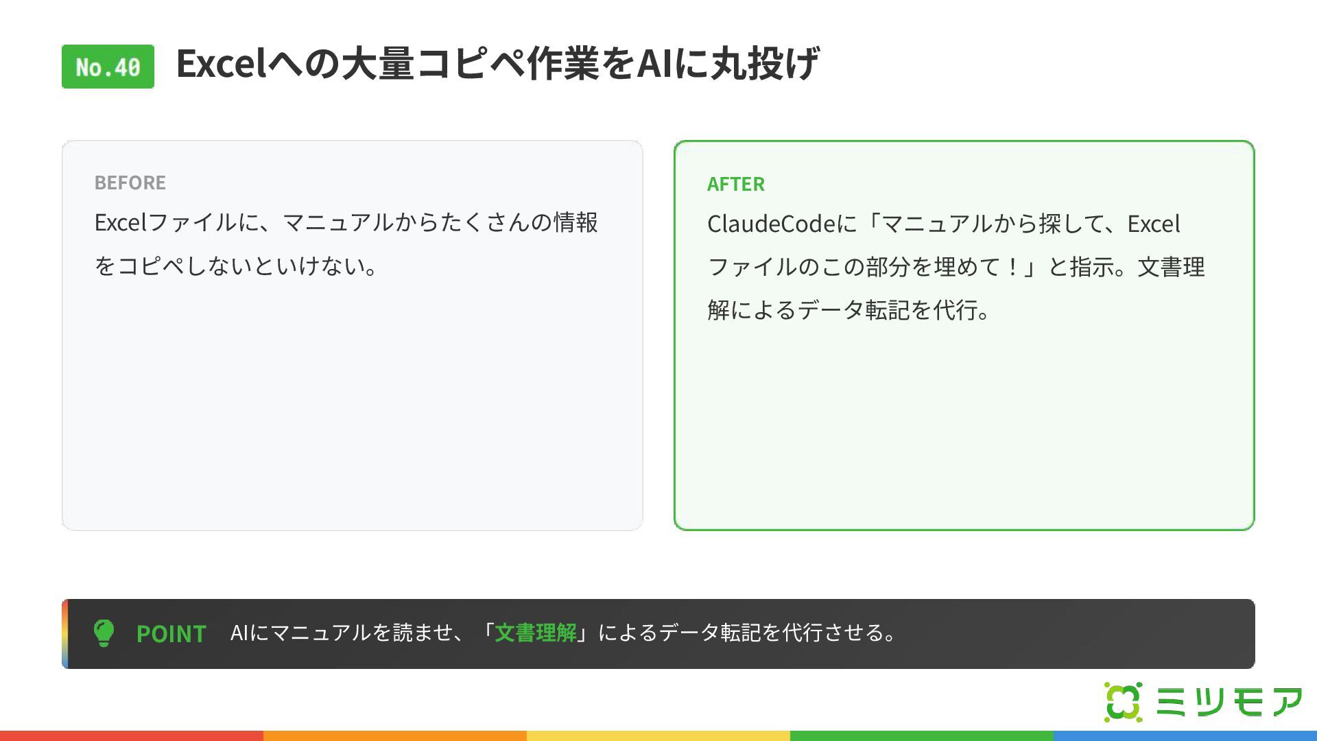 Excelへの⼤量コピペ作業をAIに丸投げ POINT AIにマニュアルを読ませ、「⽂書理解」によるデータ転記を代⾏させる。 BEFORE Excelファイルに、マニュアルからたくさんの情報 をコピペしないといけない。 AFTER ClaudeCodeに「マニュアルから探して、Excel ファイルのこの部分を埋めて!」と指⽰。⽂書理 解によるデータ転記を代⾏。