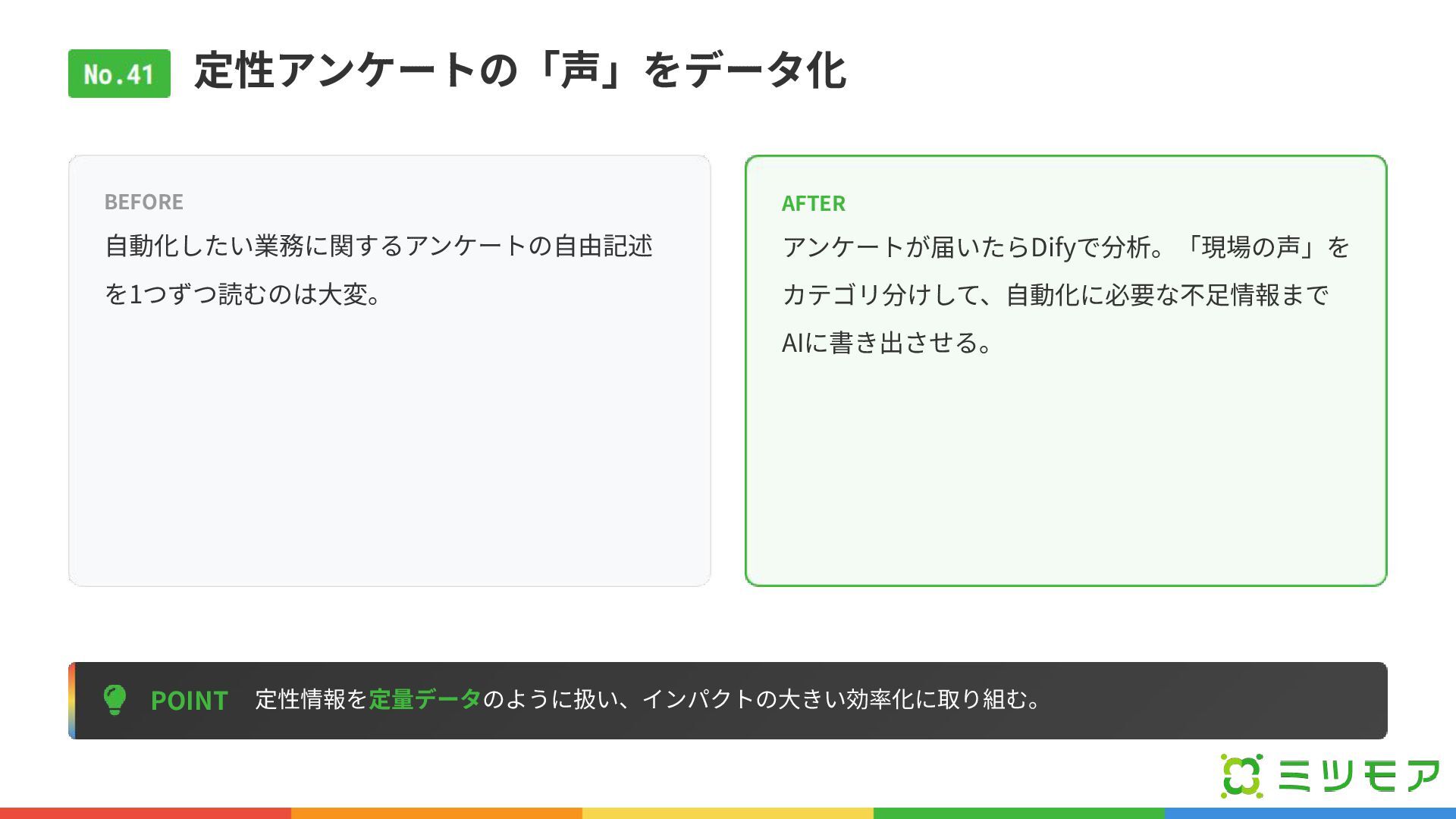 定性アンケートの「声」をデータ化 POINT 定性情報を定量データのように扱い、インパクトの⼤きい効率化に取り組む。 BEFORE ⾃動化したい業務に関するアンケートの⾃由記述 を1つずつ読むのは⼤変。 AFTER アンケートが届いたらDifyで分析。「現場の声」を カテゴリ分けして、⾃動化に必要な不⾜情報まで AIに書き出させる。