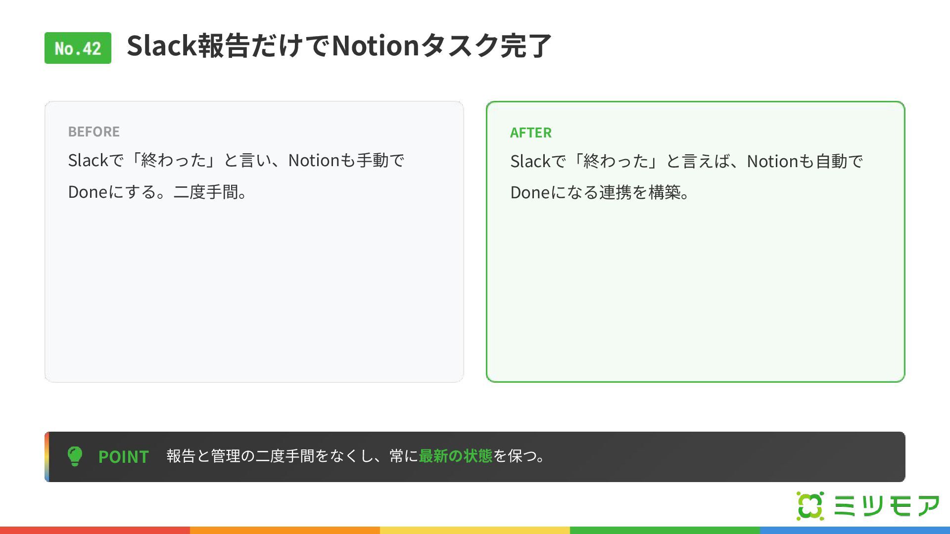 Slack報告だけでNotionタスク完了 POINT 報告と管理の⼆度⼿間をなくし、常に最新の状態を保つ。 BEFORE Slackで「終わった」と⾔い、Notionも⼿動で Doneにする。⼆度⼿間。 AFTER Slackで「終わった」と⾔えば、Notionも⾃動で Doneになる連携を構築。