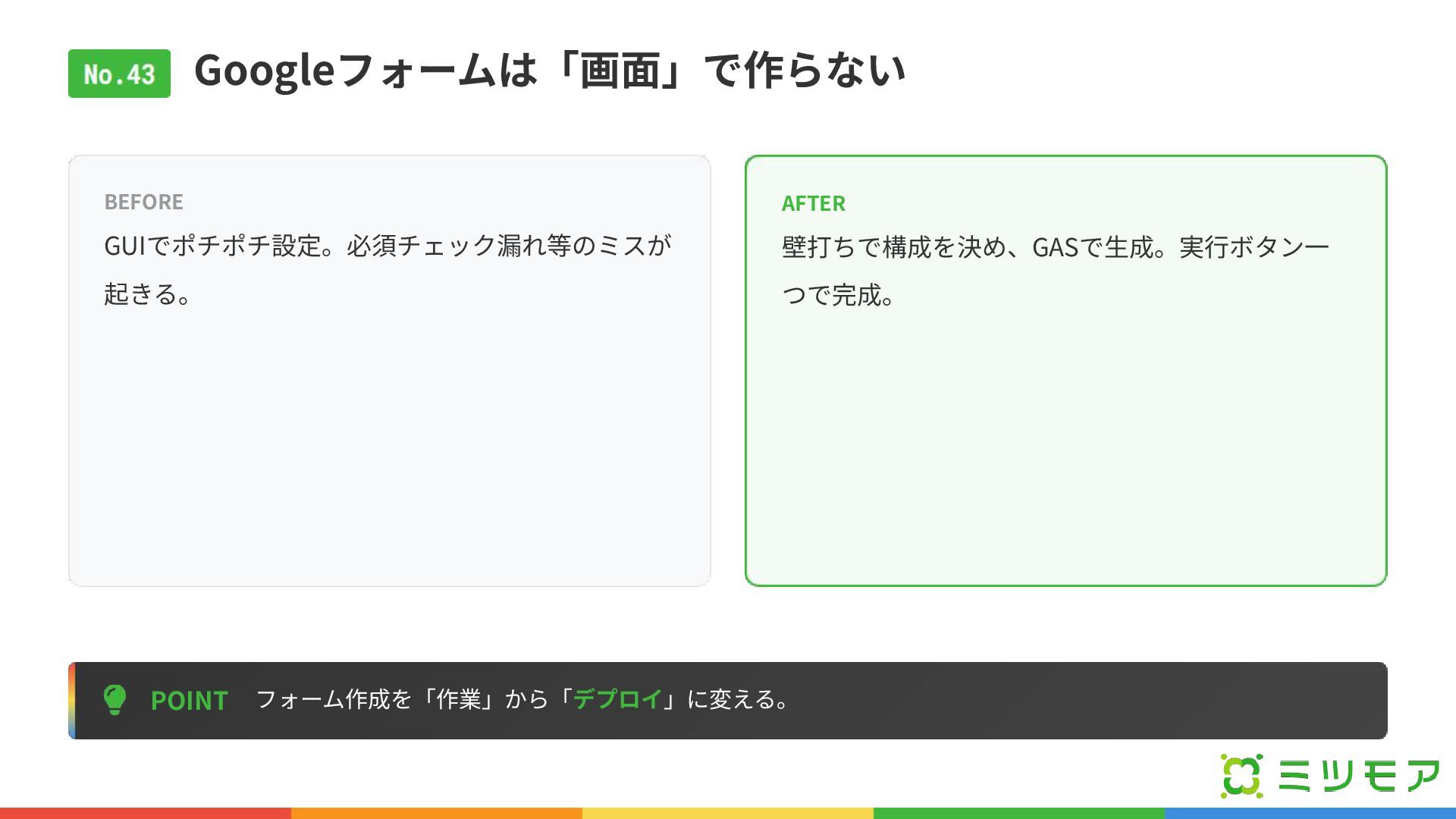 Googleフォームは「画⾯」で作らない POINT フォーム作成を「作業」から「デプロイ」に変える。 BEFORE GUIでポチポチ設定。必須チェック漏れ等のミスが 起きる。 AFTER 壁打ちで構成を決め、GASで⽣成。実⾏ボタン⼀ つで完成。