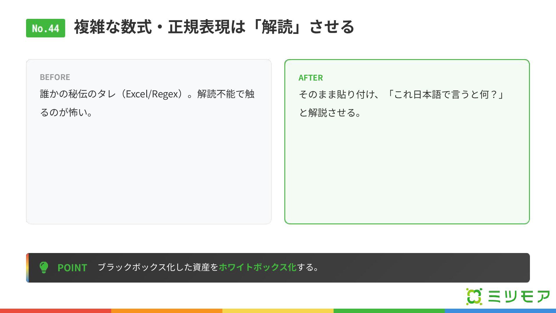 複雑な数式‧正規表現は「解読」させる POINT ブラックボックス化した資産をホワイトボックス化する。 BEFORE 誰かの秘伝のタレ(Excel/Regex)。解読不能で触 るのが怖い。 AFTER そのまま貼り付け、「これ⽇本語で⾔うと何?」 と解説させる。