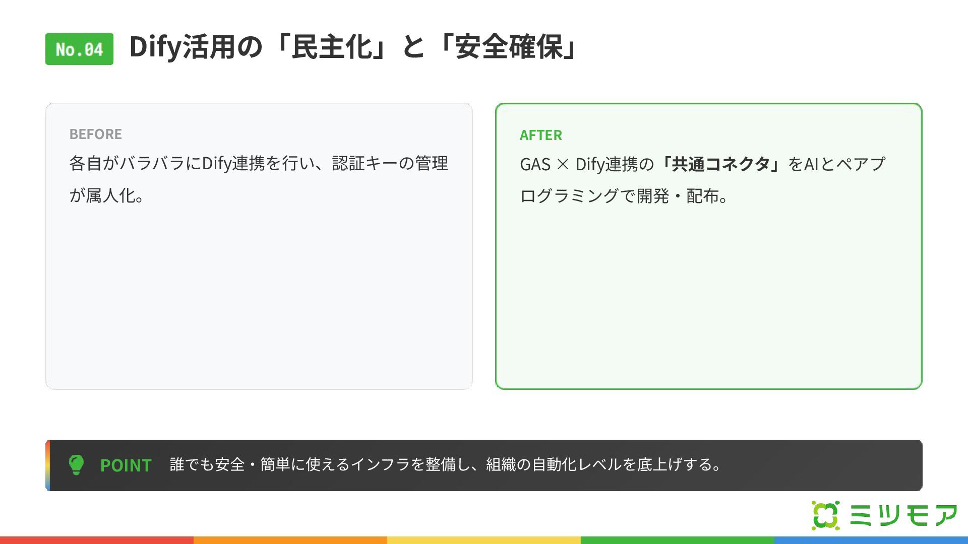 Dify活⽤の「⺠主化」と「安全確保」 POINT 誰でも安全‧簡単に使えるインフラを整備し、組織の⾃動化レベルを底上げする。 BEFORE 各⾃がバラバラにDify連携を⾏い、認証キーの管理 が属⼈化。 AFTER GAS × Dify連携の「共通コネクタ」をAIとペアプ