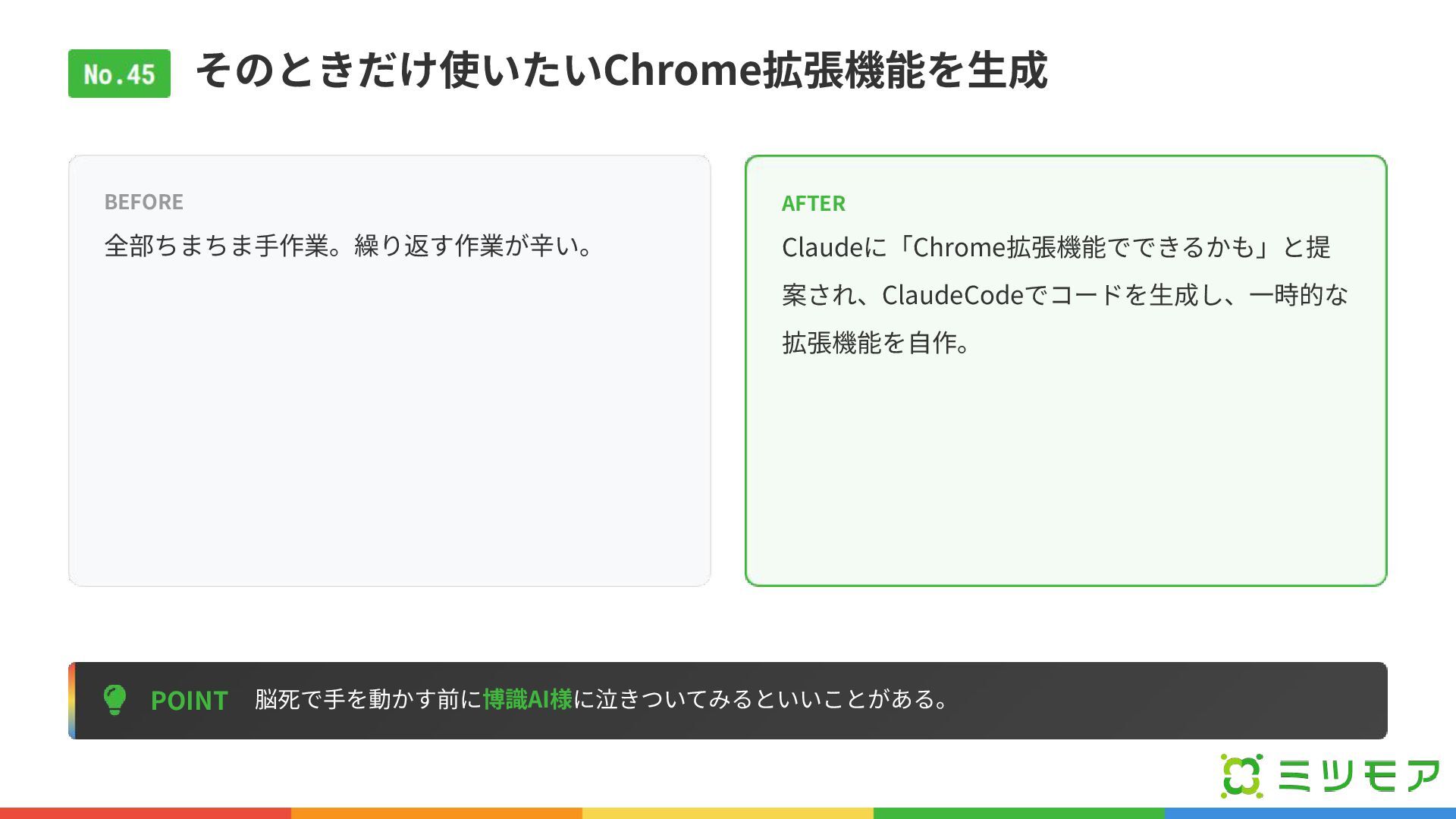 そのときだけ使いたいChrome拡張機能を⽣成 POINT 脳死で⼿を動かす前に博識AI様に泣きついてみるといいことがある。 BEFORE 全部ちまちま⼿作業。繰り返す作業が⾟い。 AFTER Claudeに「Chrome拡張機能でできるかも」と提 案され、ClaudeCodeでコードを⽣成し、⼀時的な 拡張機能を⾃作。