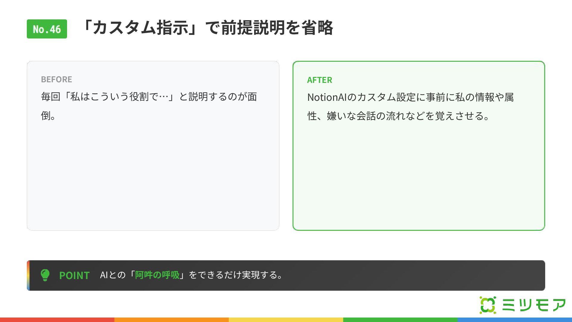 「カスタム指⽰」で前提説明を省略 POINT AIとの「阿吽の呼吸」をできるだけ実現する。 BEFORE 毎回「私はこういう役割で…」と説明するのが⾯ 倒。 AFTER NotionAIのカスタム設定に事前に私の情報や属 性、嫌いな会話の流れなどを覚えさせる。